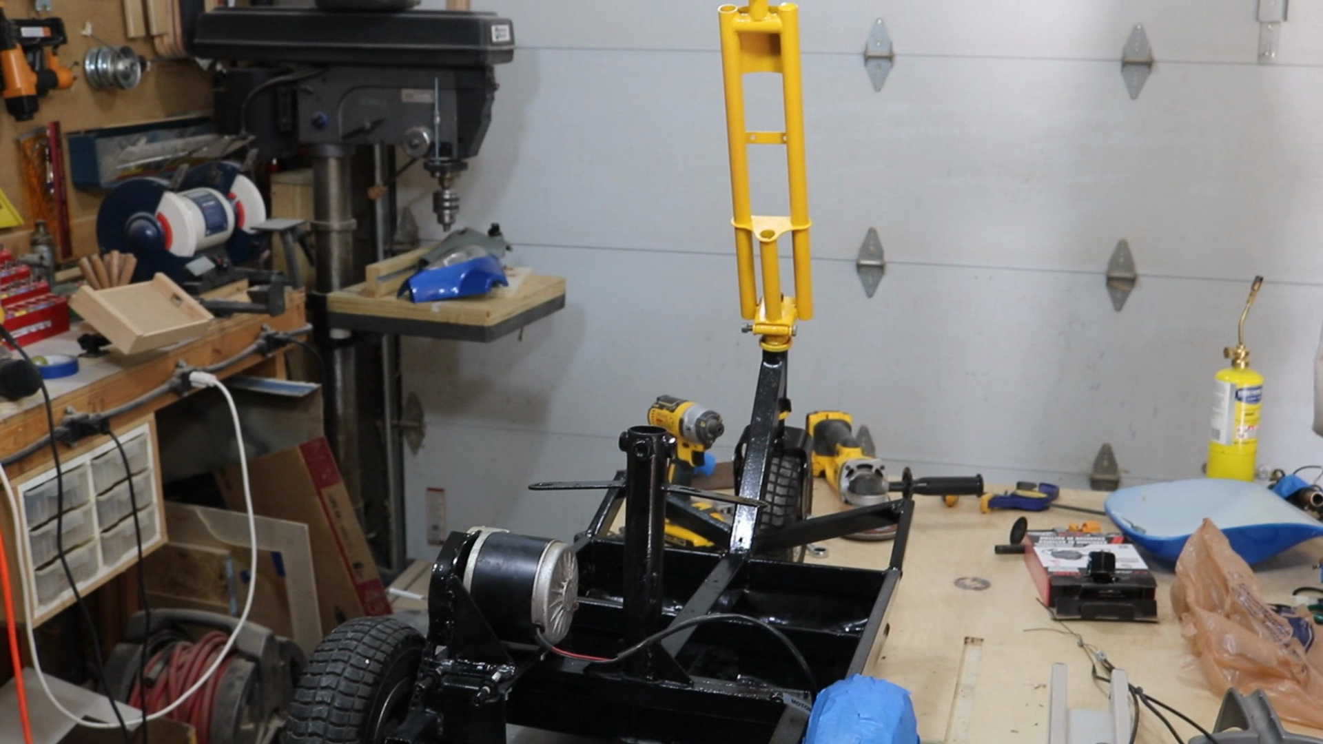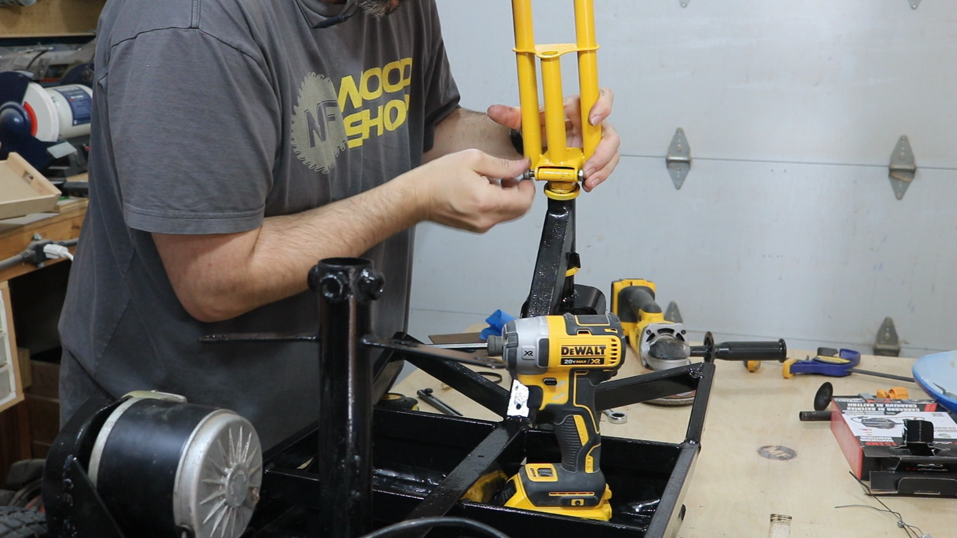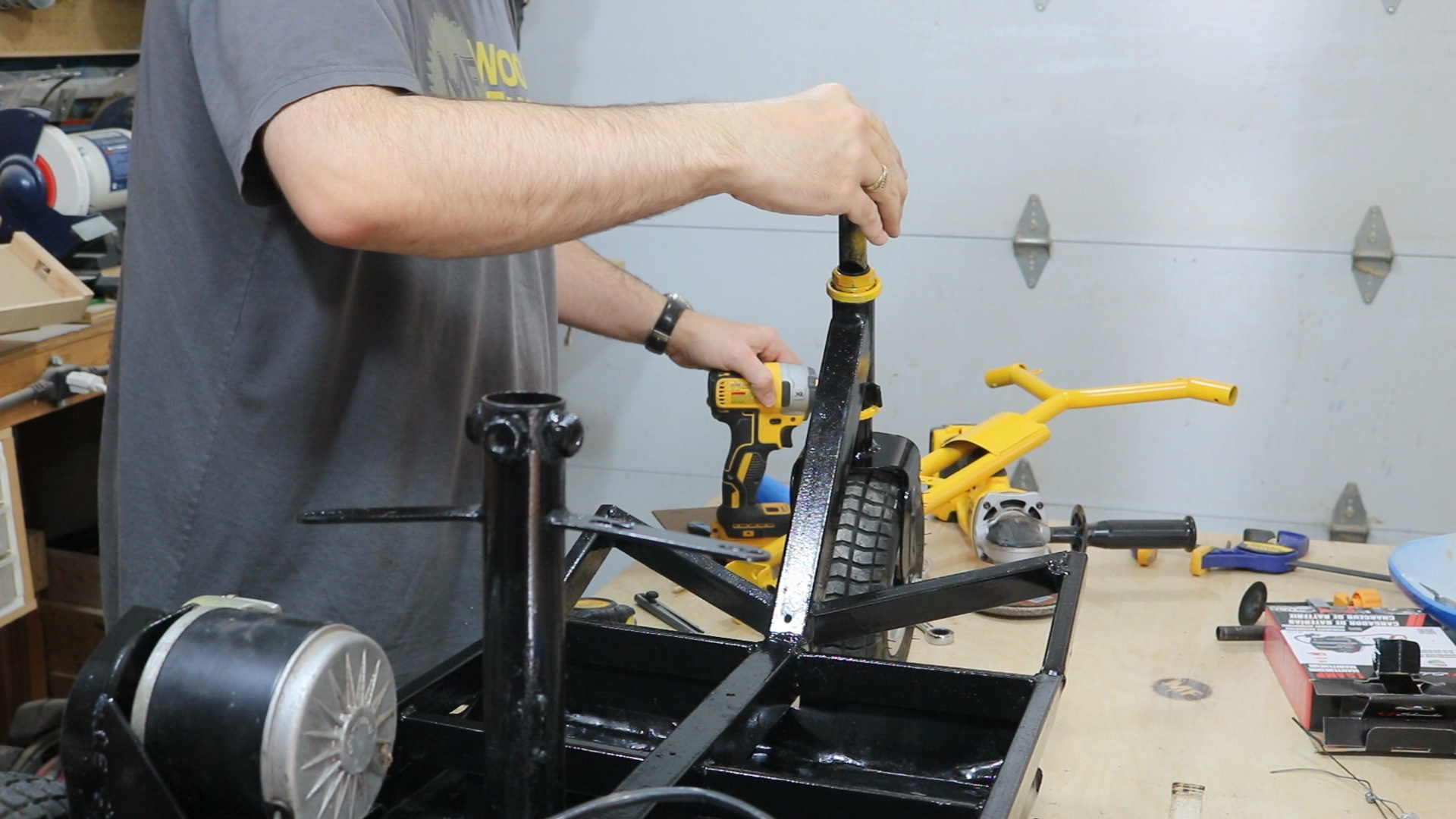 The front tire fork assembly. After everything got paint it was time to put this back together. The fork goes in first from the bottom. Then a bearing assembly, followed by a grease capped nut and a standard nut. On the inside a wedge shaped piece goes inside the steering neck get bolted on to that. The steering column gets a bolt and nut loosely tighten in order to fold down. One more hex bolt goes tors the front this bolt comes out if you want to fold the handles down.