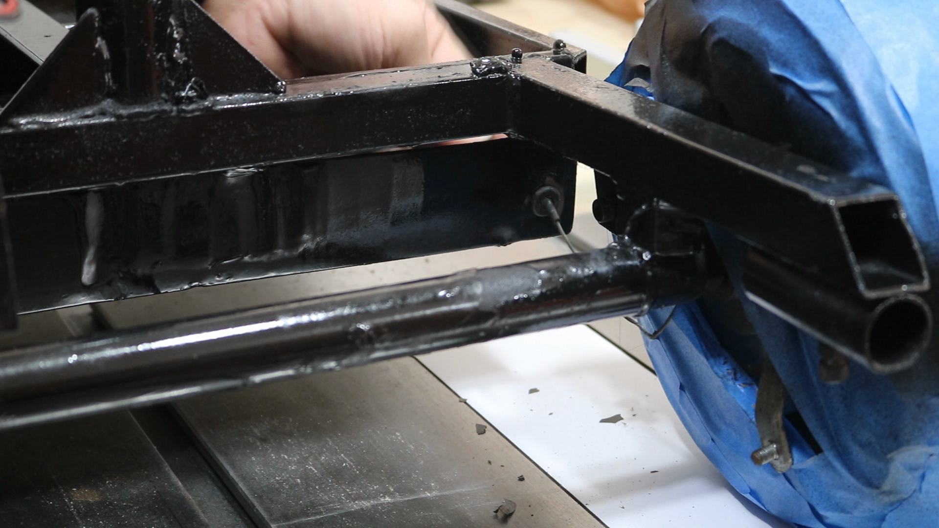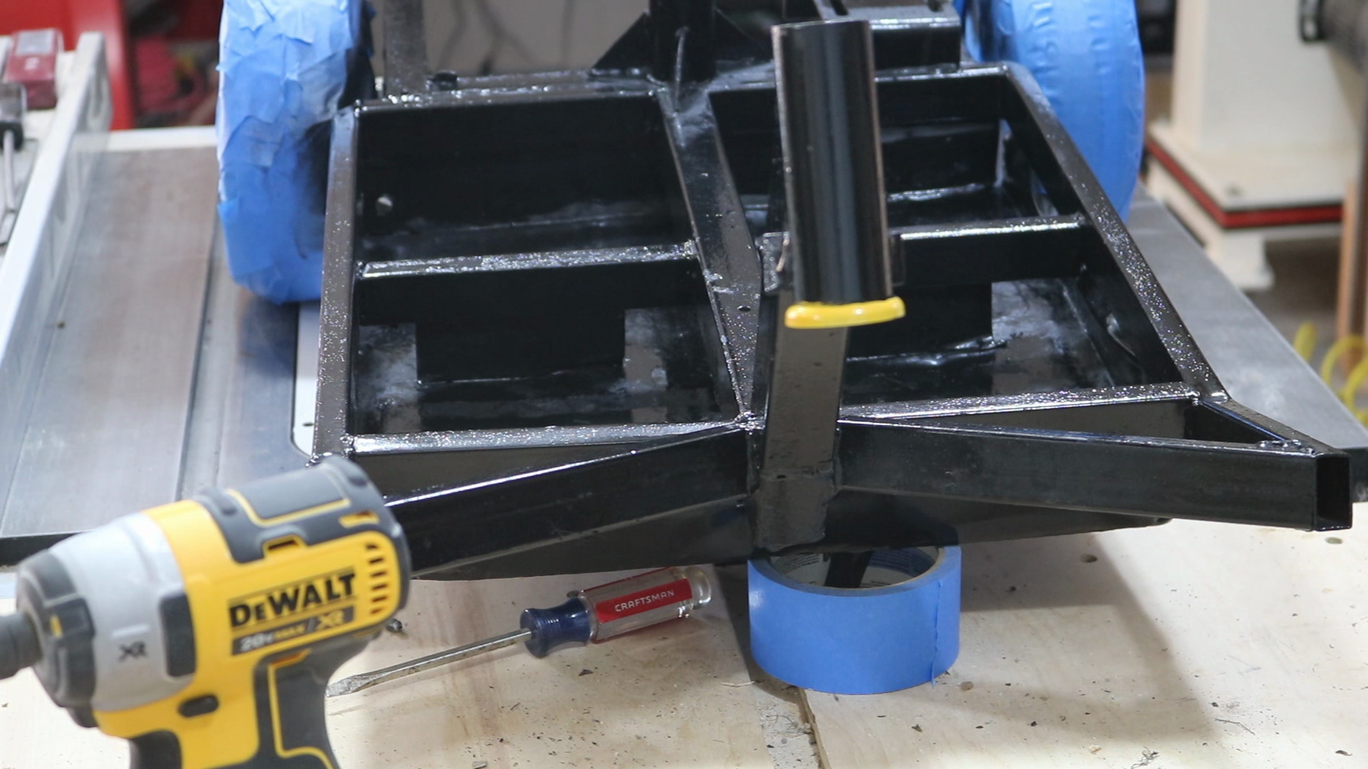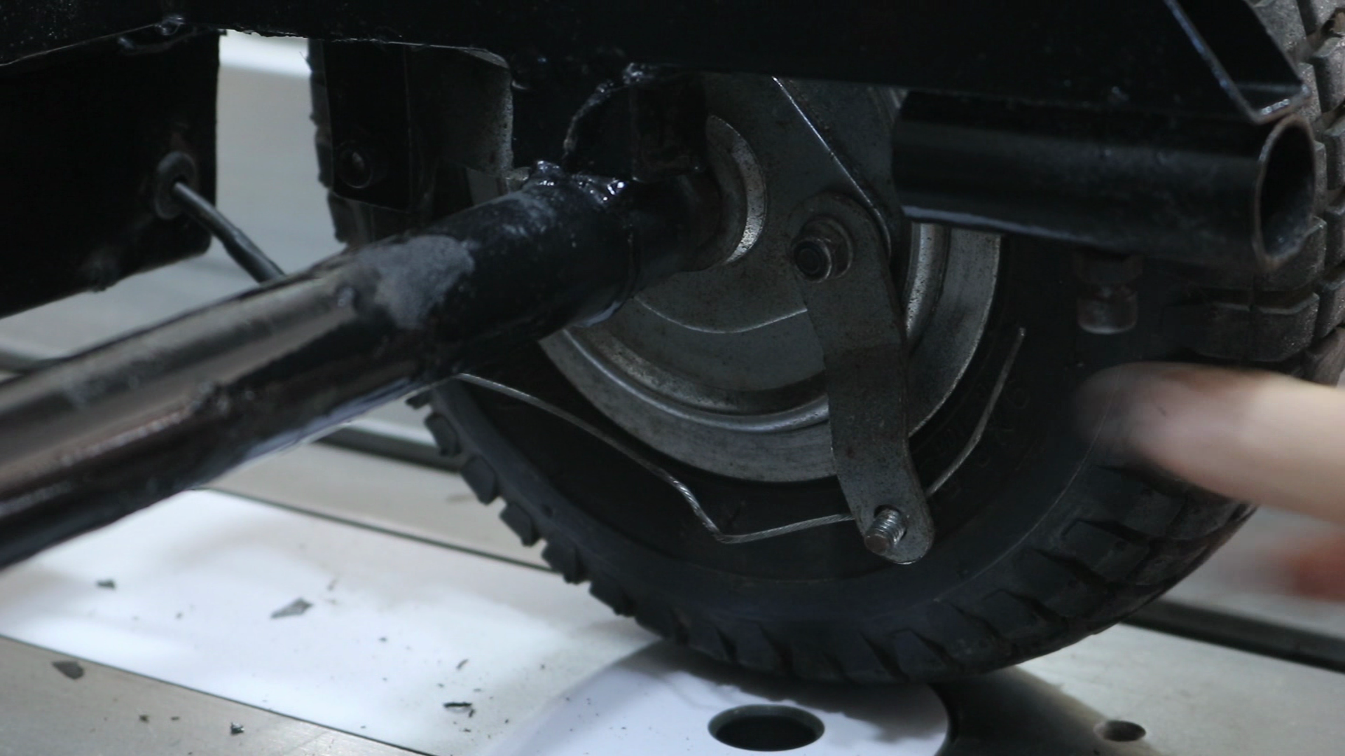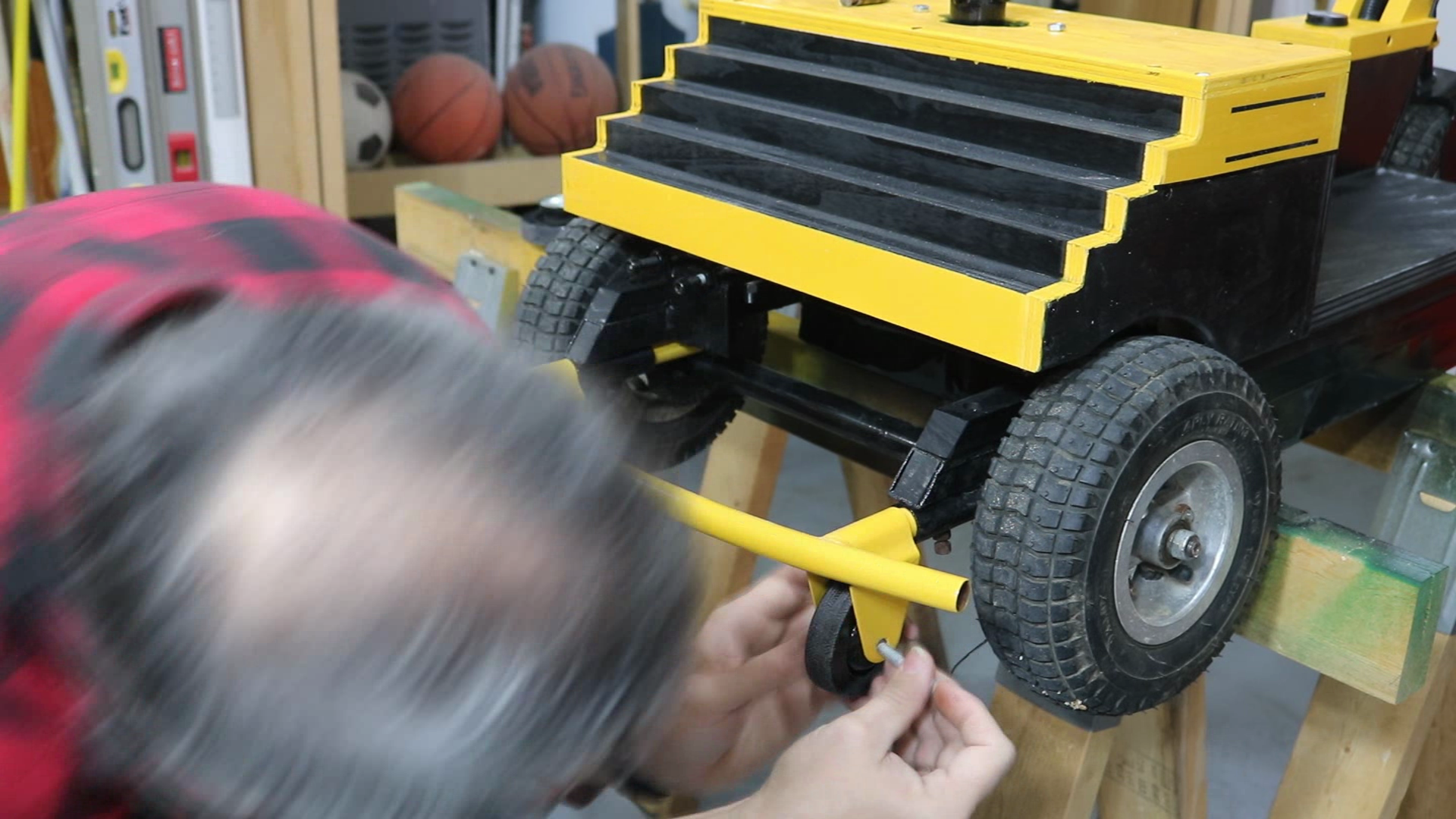 The front tire fork assembly. After everything got paint it was time to put this back together. The fork goes in first from the bottom. Then a bearing assembly, followed by a grease capped nut and a standard nut. On the inside a wedge shaped piece goes inside the steering neck get bolted on to that. The steering column gets a bolt and nut loosely tighten in order to fold down. One more hex bolt goes tors the front this bolt comes out if you want to fold the handles down.