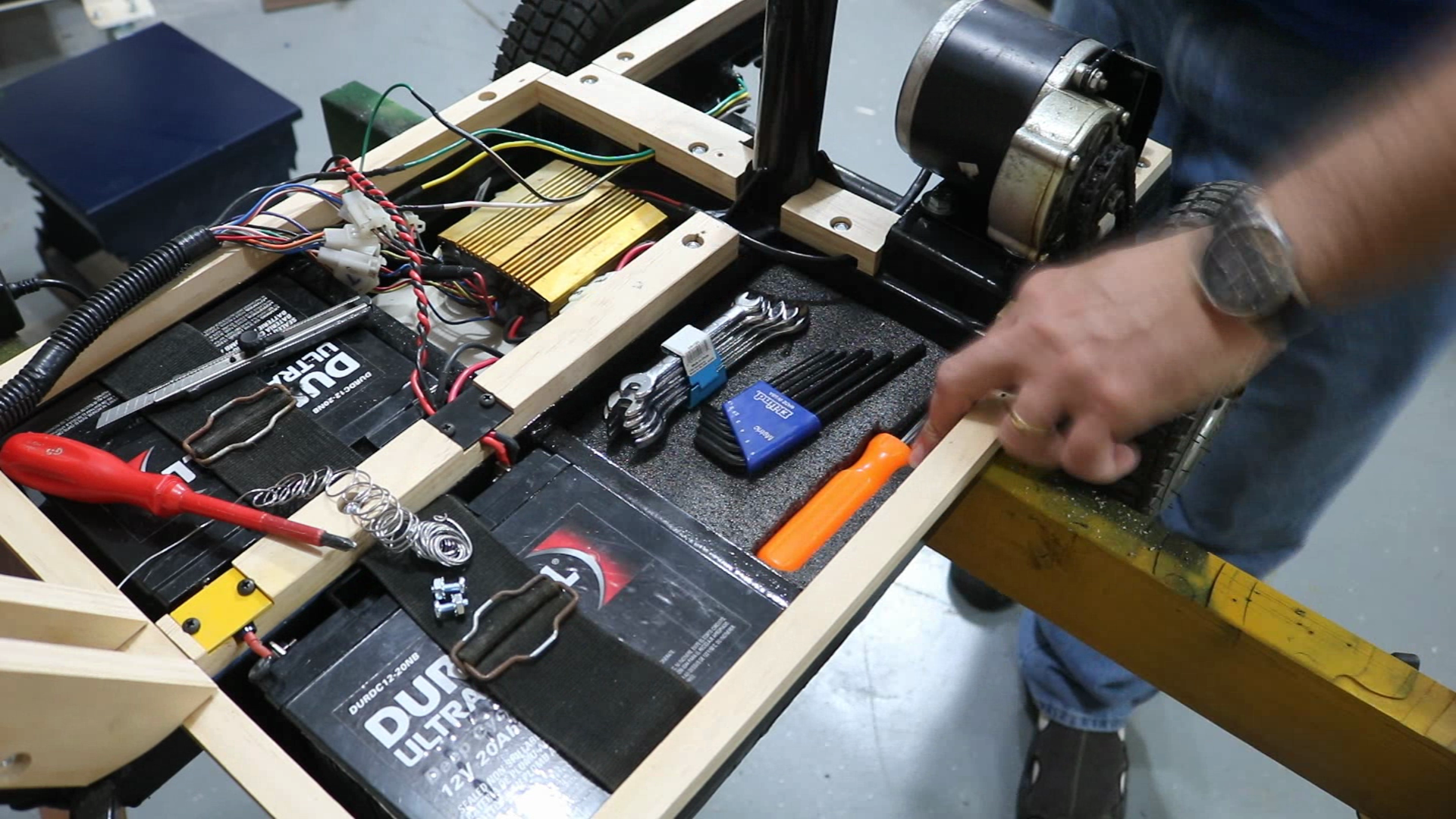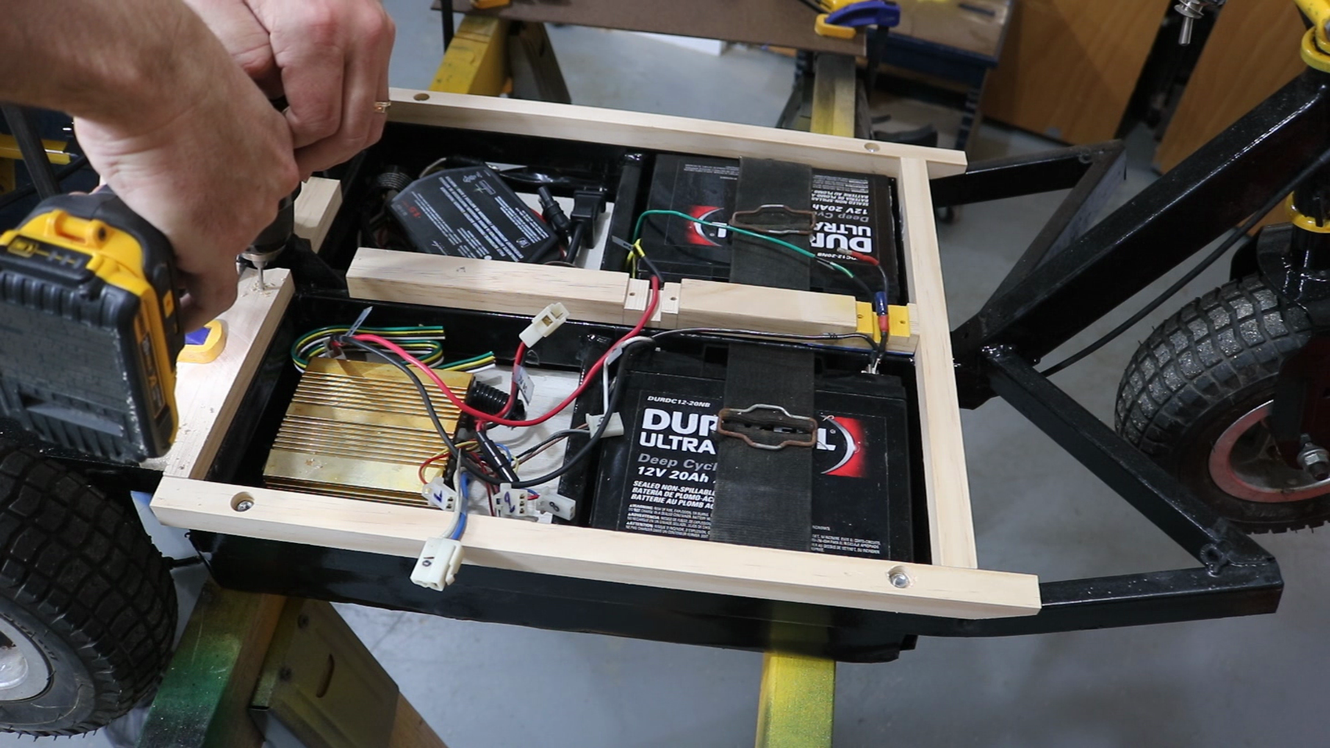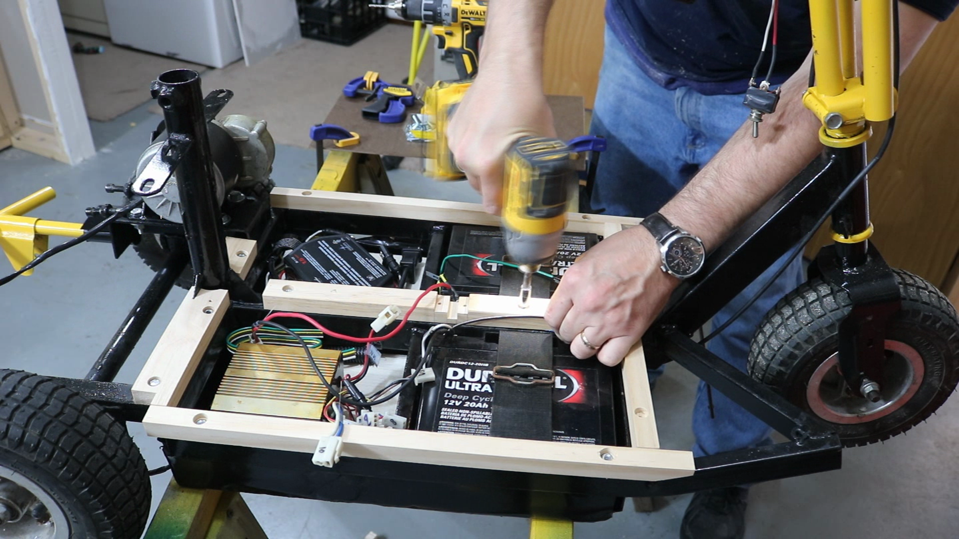 The floor board holds the batteries, the computer and the wires all start or end up there at some point. First I need to run the brake cable to the rear wheel. I won’t be able to do this after the components get put in. The cable runs from the left handle bar to the right wheel. It goes in though the front of the floor board pan and out the rear. I use 1/4″ grommets to protect the cable something the manufacture didn’t do. Grommets are good to have around the shop they come in handy. Next, I placed the board into the floor board the mount the computer. This board is held in with hot glue. The front two compartments is where the batteries go. I place two strips of weather tape to help with vibrations. Not completely necessary being AGM batteries it don’t matter to much.