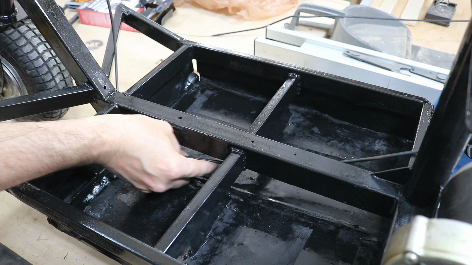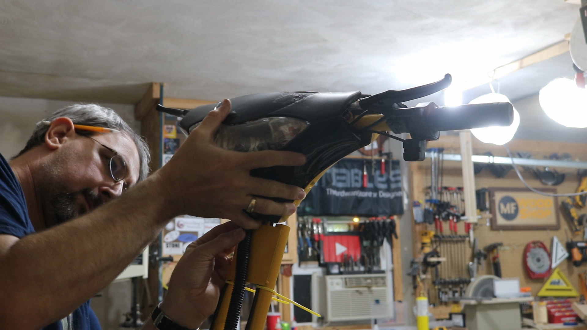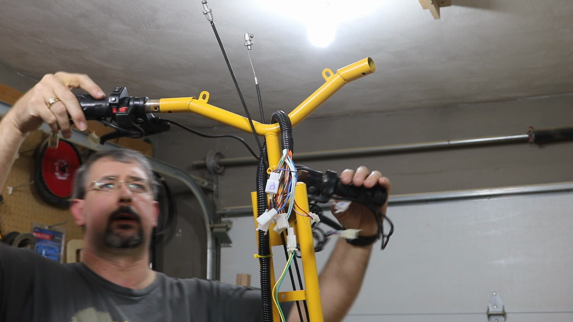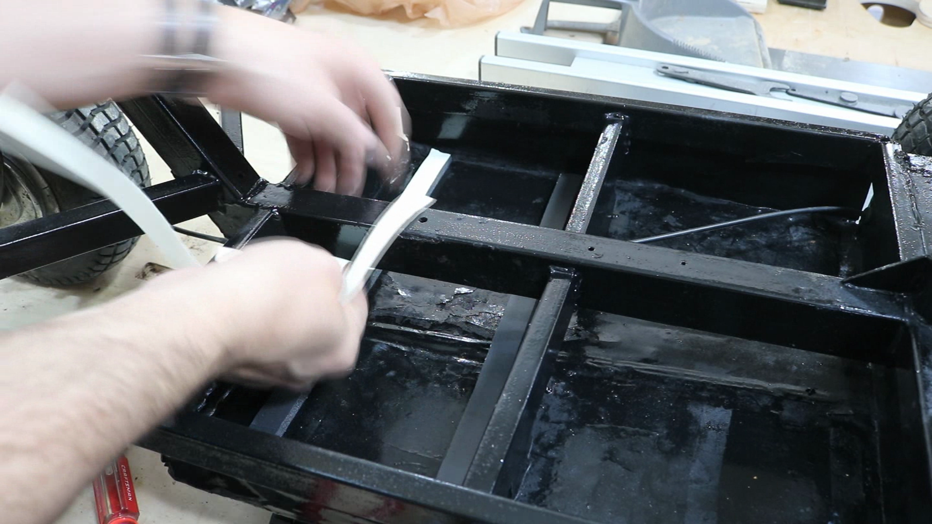 The floor board holds the batteries, the computer and the wires all start or end up there at some point. First I need to run the brake cable to the rear wheel. I won’t be able to do this after the components get put in. The cable runs from the left handle bar to the right wheel. It goes in though the front of the floor board pan and out the rear. I use 1/4″ grommets to protect the cable something the manufacture didn’t do. Grommets are good to have around the shop they come in handy. Next, I placed the board into the floor board the mount the computer. This board is held in with hot glue. The front two compartments is where the batteries go. I place two strips of weather tape to help with vibrations. Not completely necessary being AGM batteries it don’t matter to much.