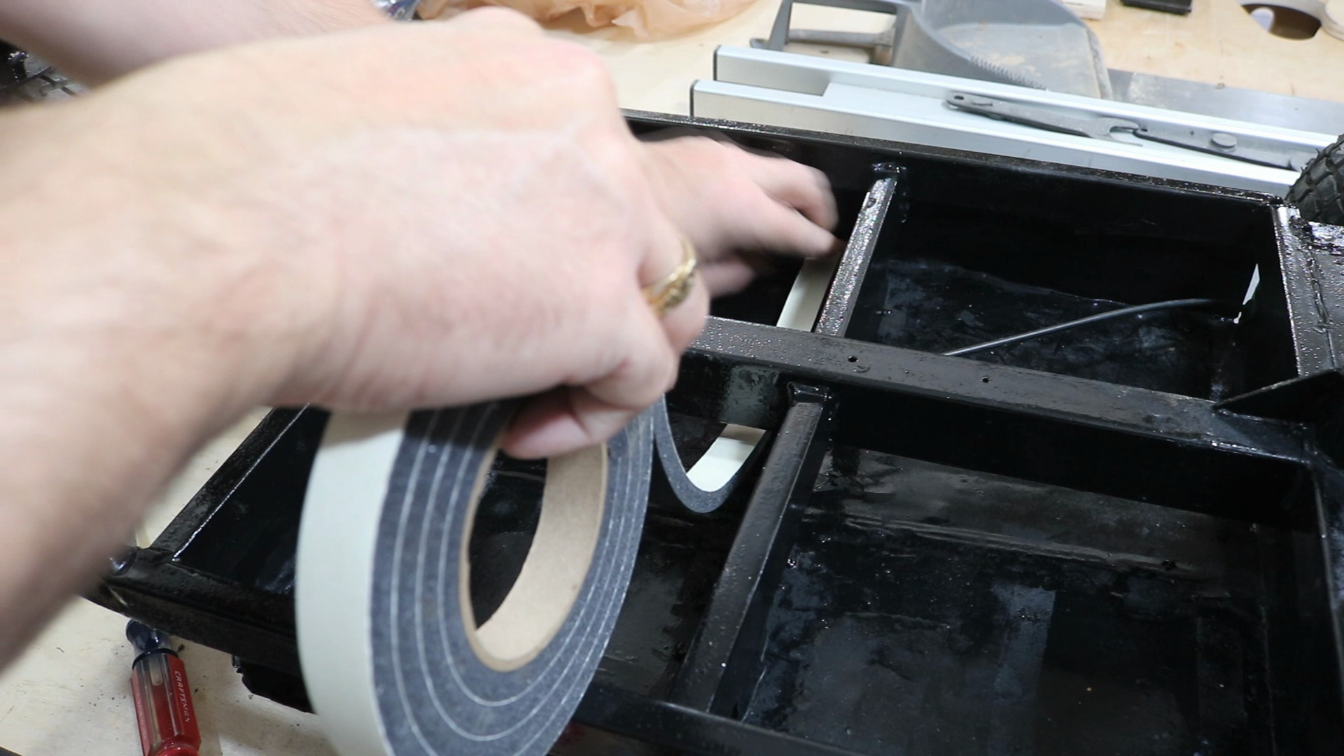 The metal frame covered by wood. This made it easier to attach the floor board and other items. Strips of wood got cut to fit in there place. after fitting each piece I drilled a hole with an 1/8″ bit. The bit went through the wood and the frame to later be attached with a sheet metal screw. Counter sank the sheet metal screws head.