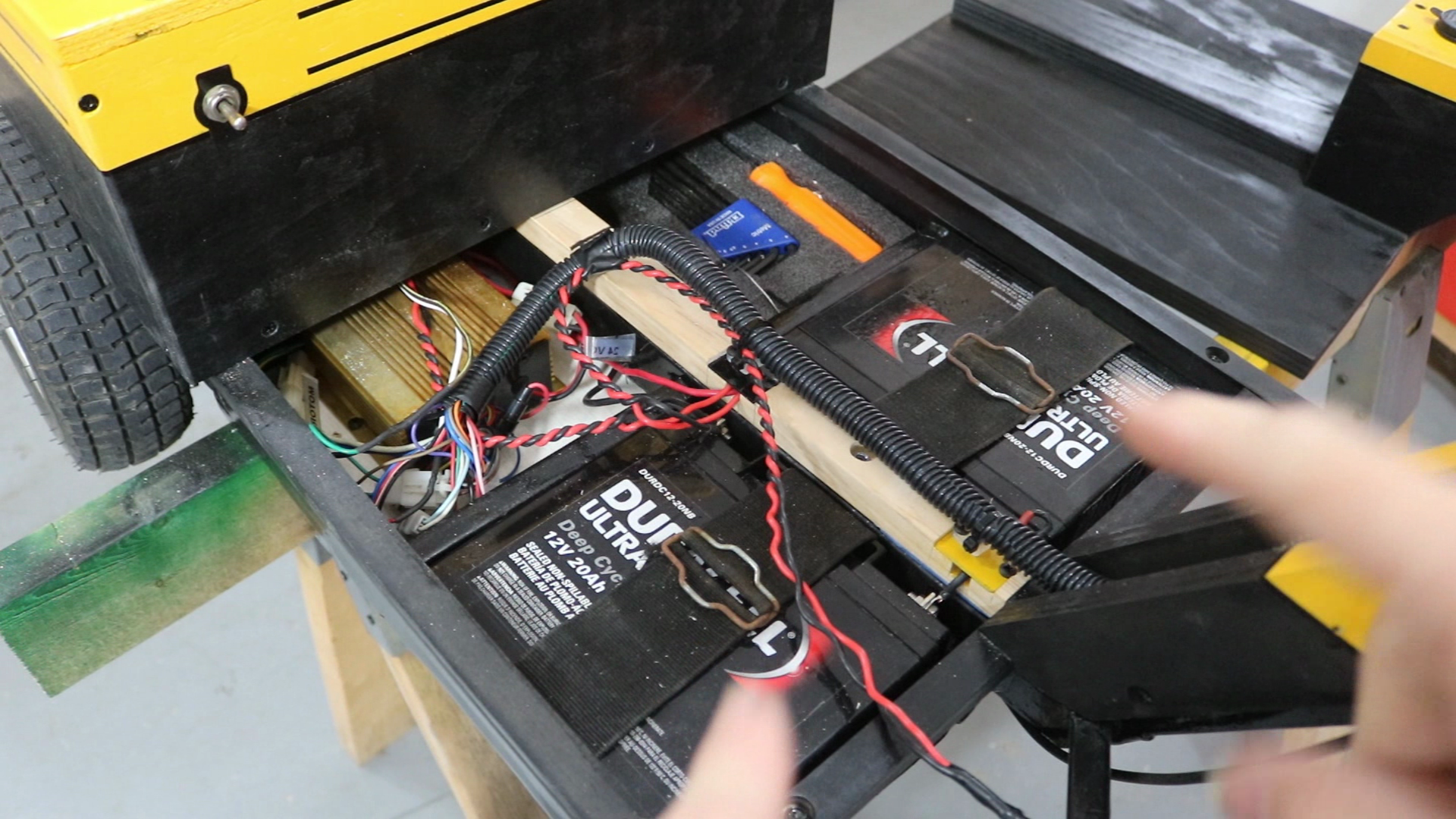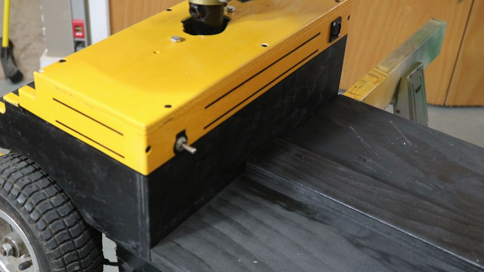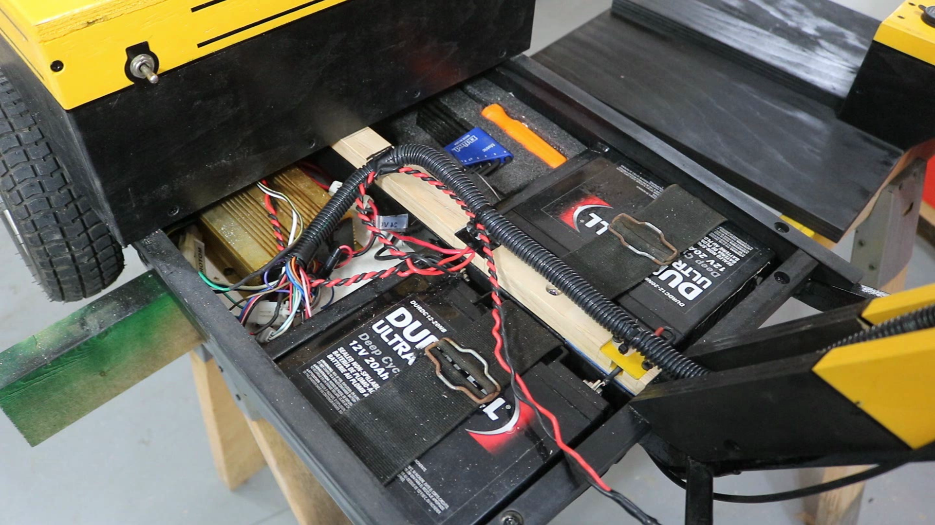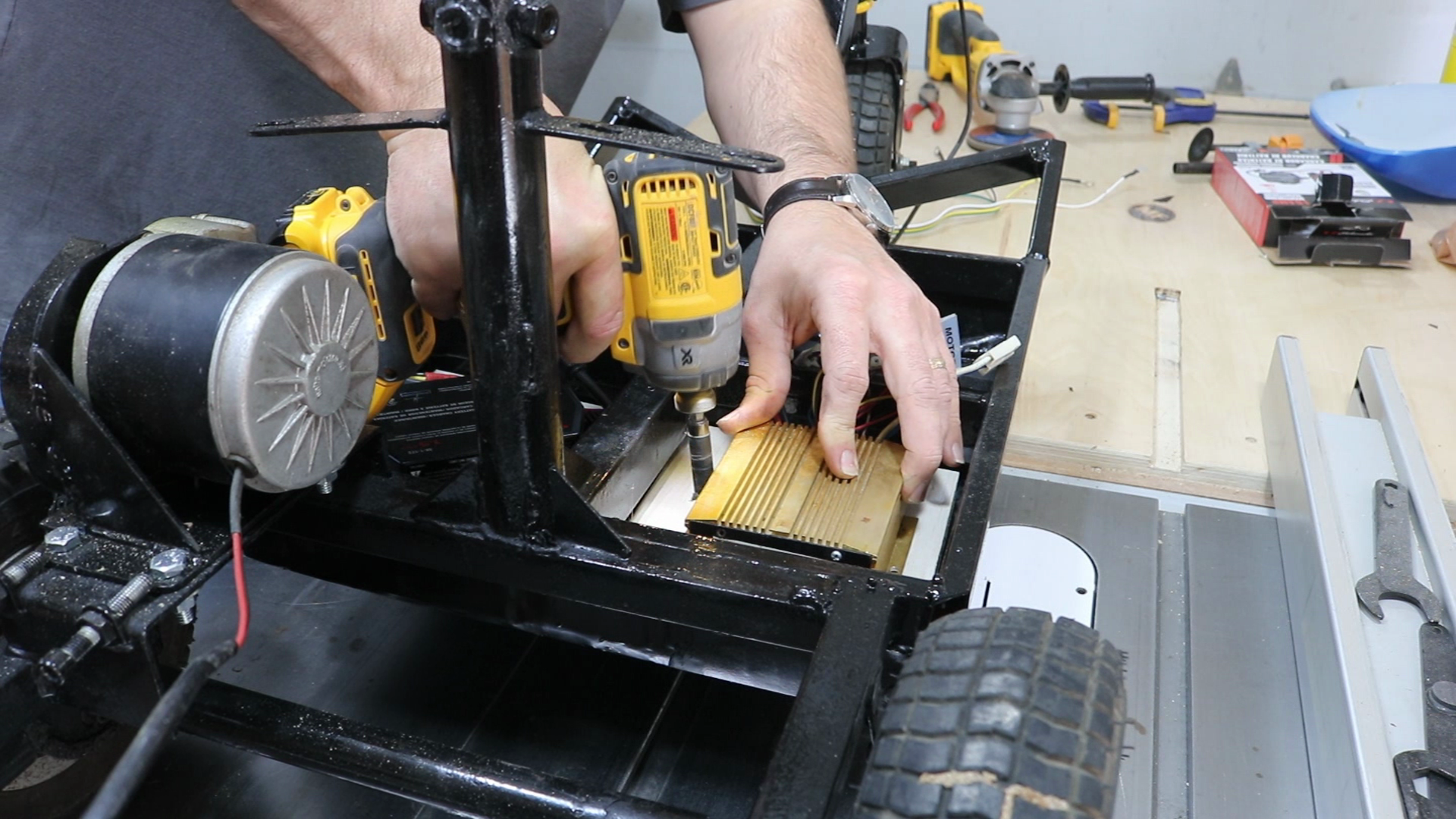 This assembly goes under the seat. It provides a motor cover, a wire housing and over looks. I designed this part to emulate the looks of a DeWalt 20 volt battery.