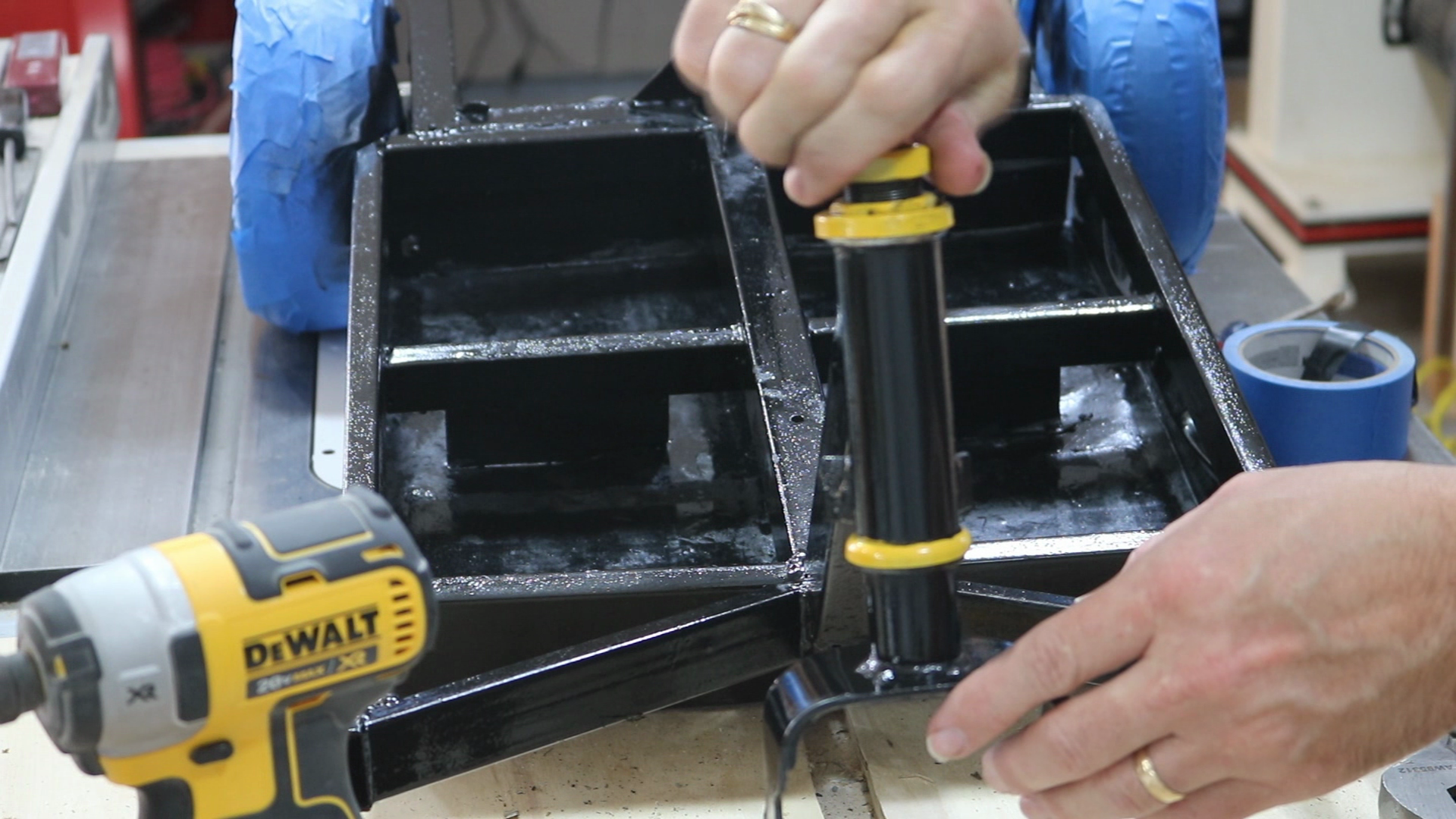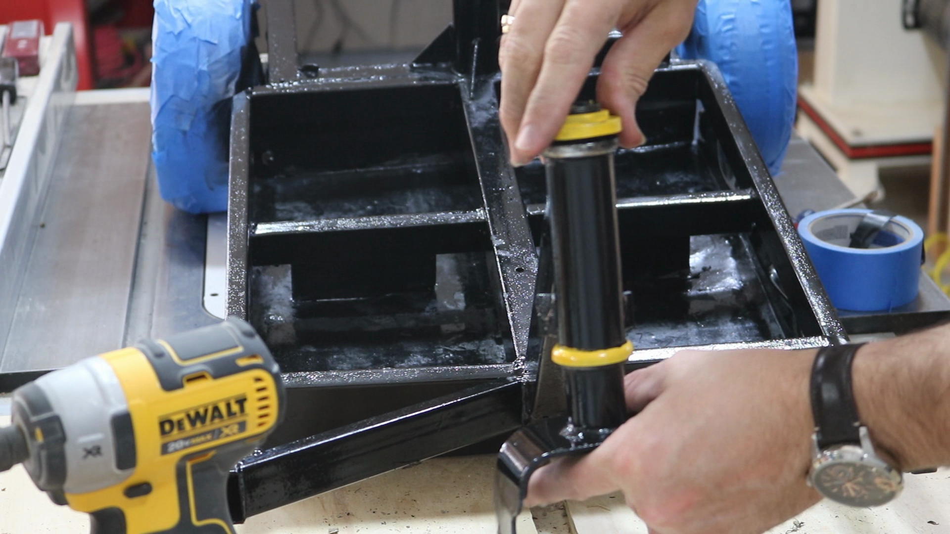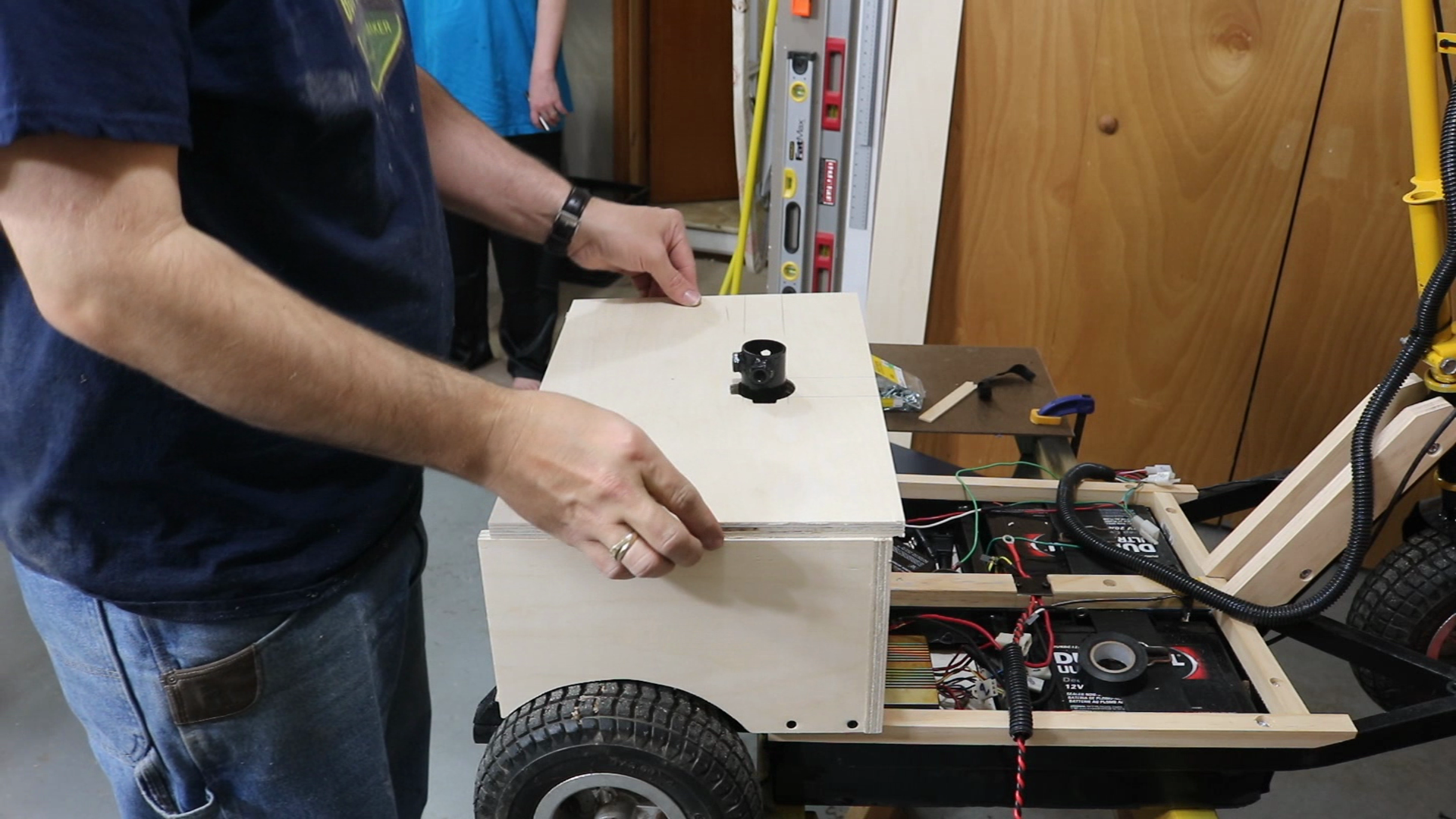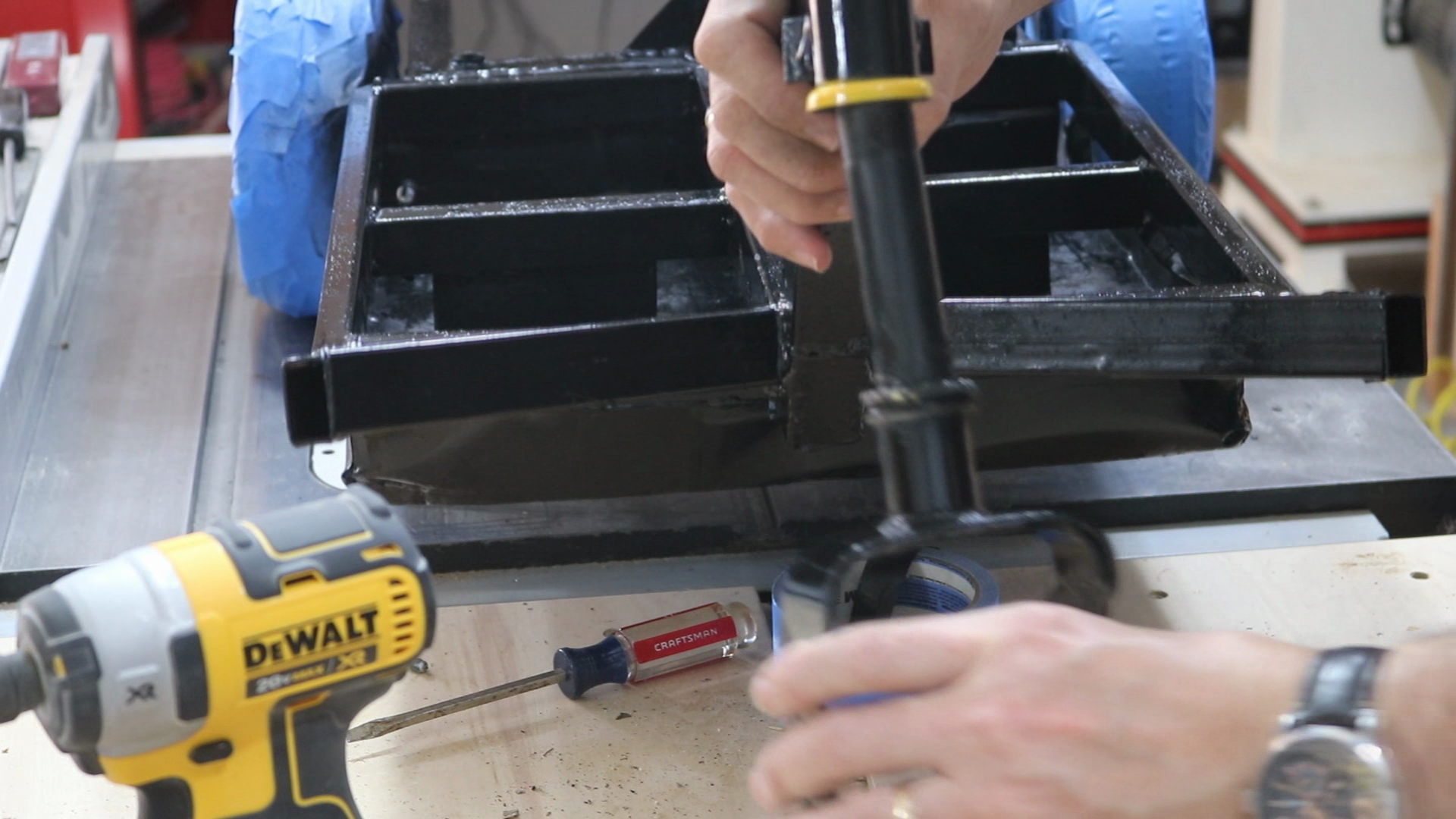 This assembly goes under the seat. It provides a motor cover, a wire housing and over looks. I designed this part to emulate the looks of a DeWalt 20 volt battery.