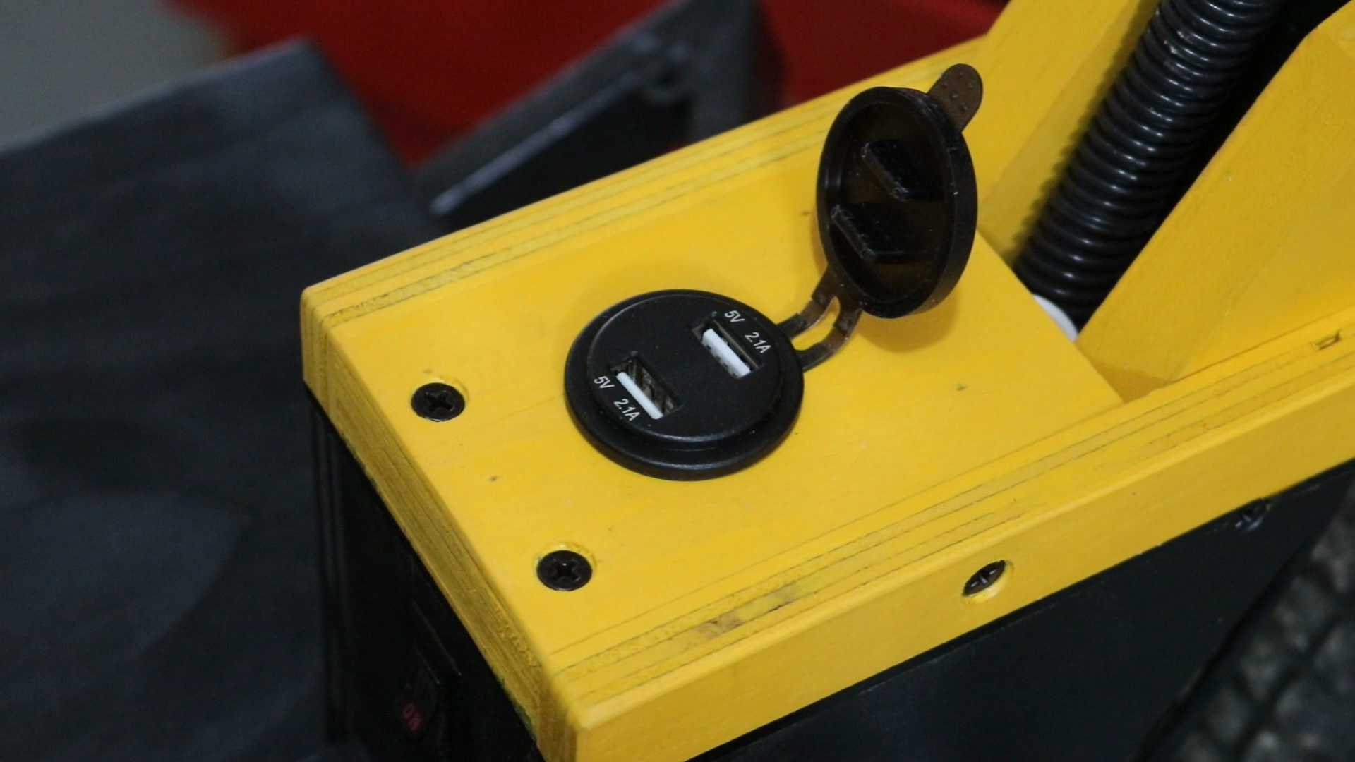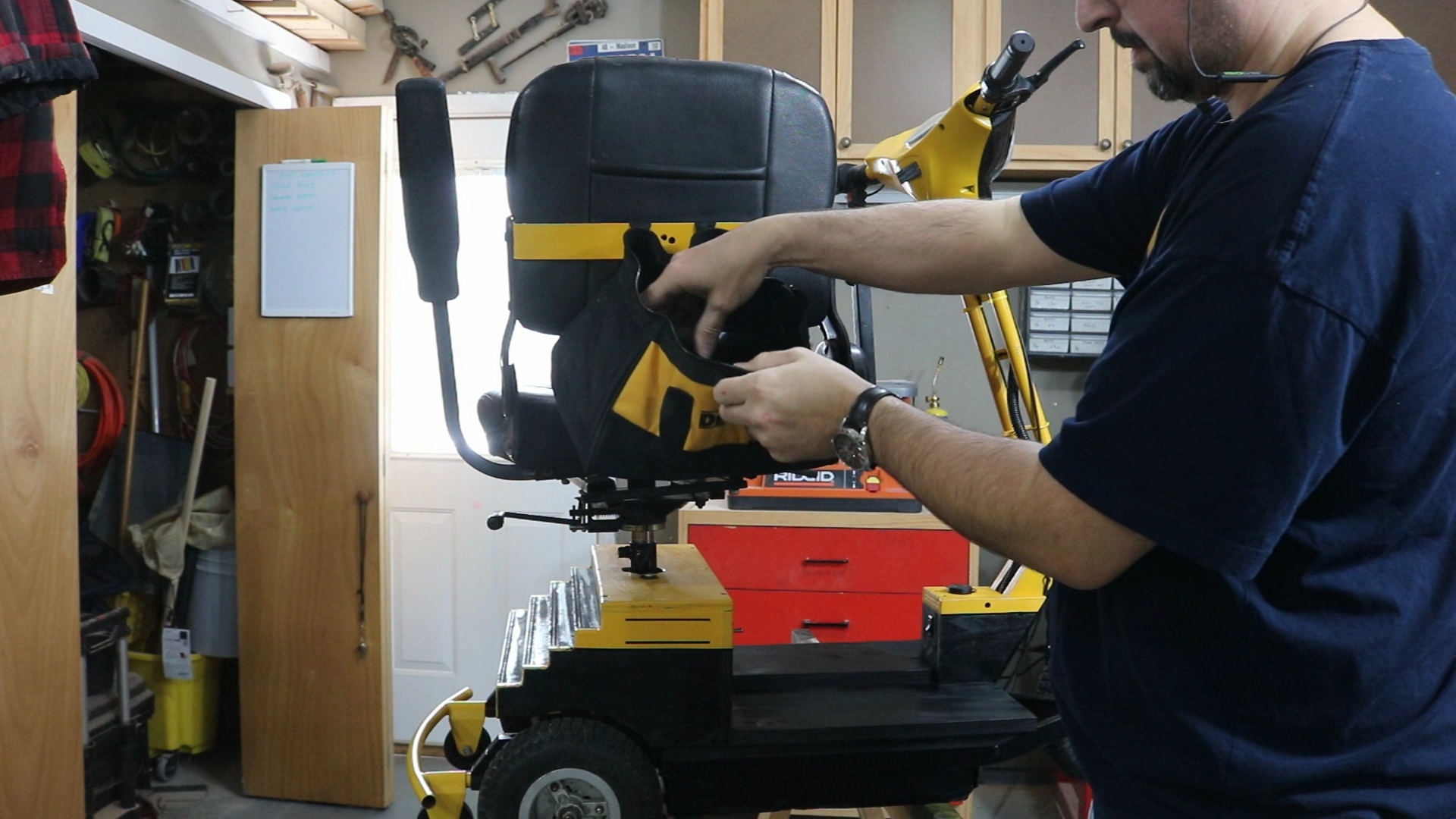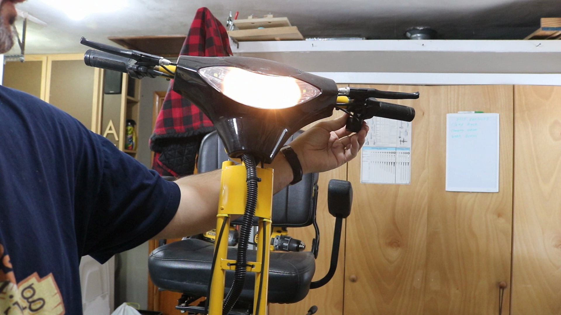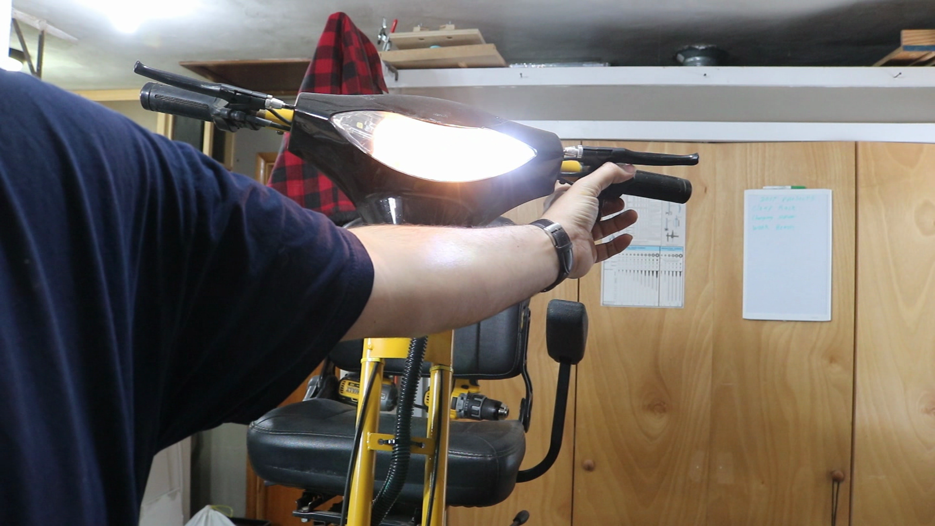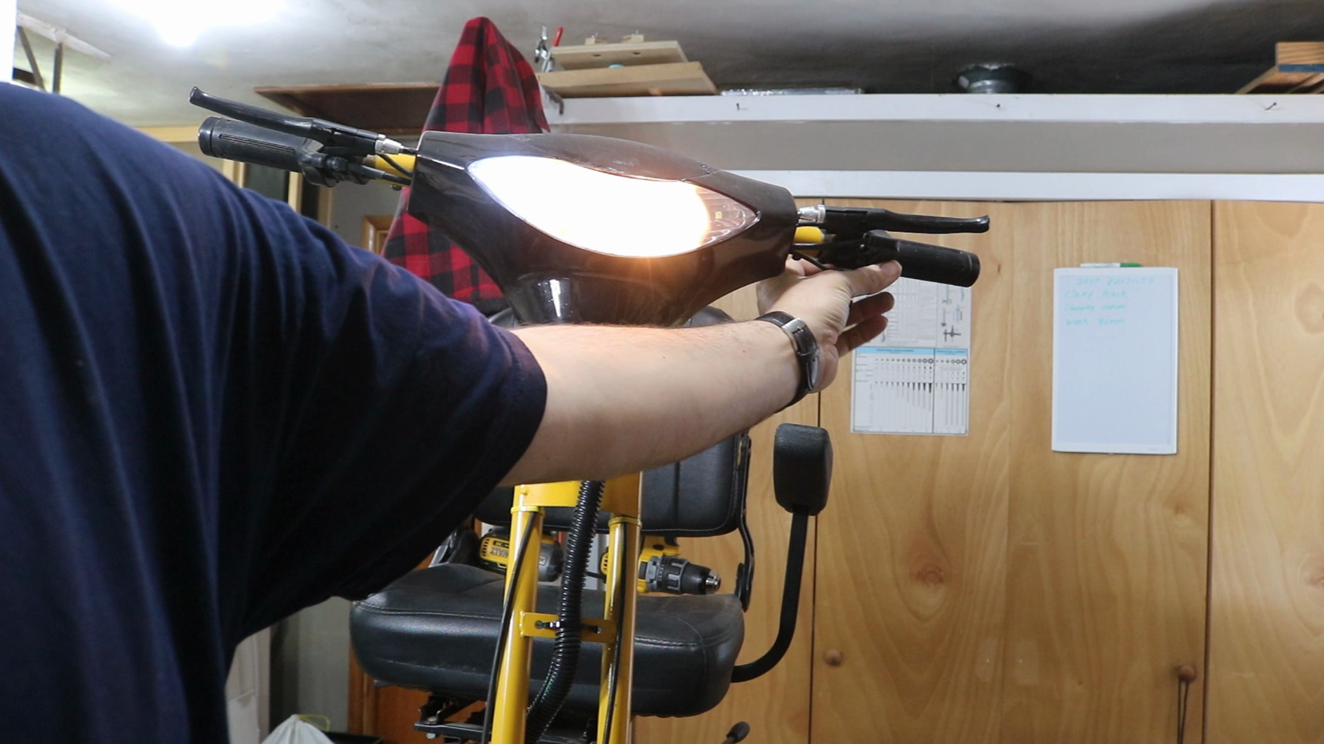 The switch put the scooter in reverse. The port on the right is a charger port. Headlight work but still need to be replaced with LED brighter bulbs. The turn signals also work and need to be replaced with yellow LED’s. Under the floor board holds two 12v AGM batteries, the computer and an extra area for tools. Added a DeWalt tool bag to the back of the seat. This stores the charger a 5mm hex wrench and a phillip screw driver. Everything you need to fold the scooter down and to get into the floorboard. The floor board is held down with four phillips screws. The handle bars fold down with a 5mm hex wrench. The charger plugs into a normal American 110v outlet, a plugs into a XLR female charger port.