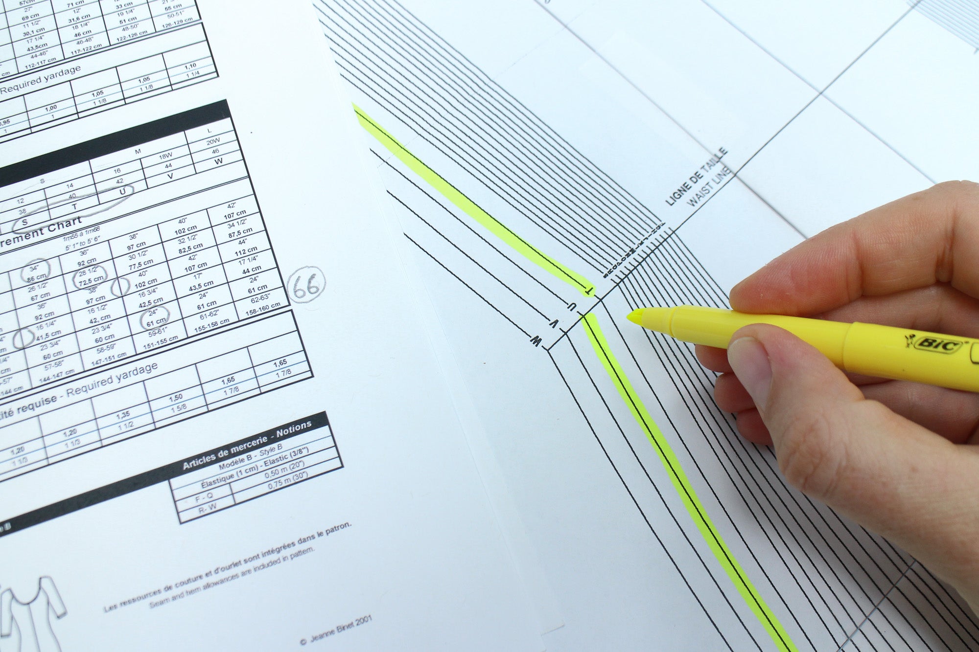 Once I've chosen my sizes, I like to outline the cut lines I'm going to use in highlighter directly on my pattern.