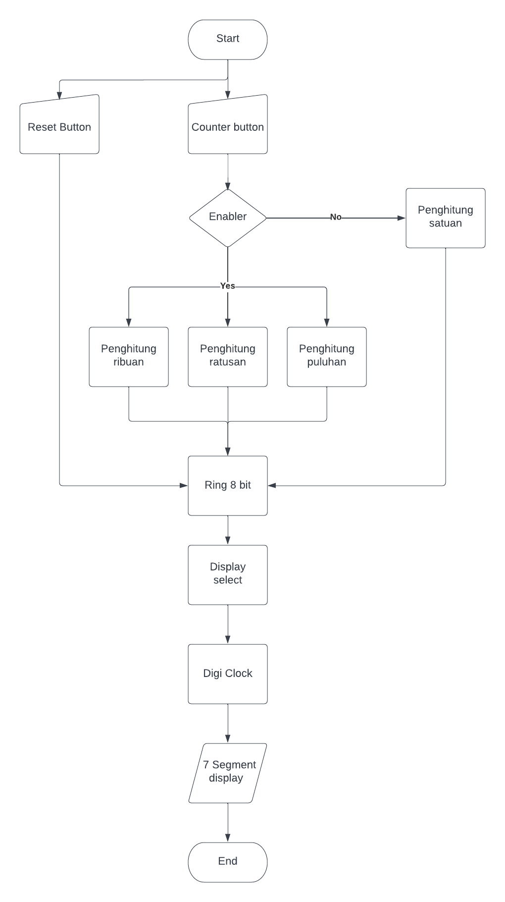 Sistem ini diprogram untuk menyimpan data yang disebabkan oleh pergantian nilai input biner (1/0). Seperti yang dapat dilihat dari block diagram diatas, dimulai jika button pada FPGA ditekan tanpa menyalakan enabler switch, maka akan keluar output angka pada 7 segment (satuan digit pertama). Namun, jika enabler switch dinyalakan, maka button yang ditekan akan mengeluarkan output angka pada 7 segment berdasarkan switch enabler mana yang dinyalakan. Pada program ini disediakan reset button untuk mengulang angka yang sudah dihitung menjadi nol. Sistem ini dapat menghitung dari 2 button dan dapat menghitung secara terpisah. Angka maksimum yang dapat ditampilkan oleh 7 Segment adalah sampai 9999.