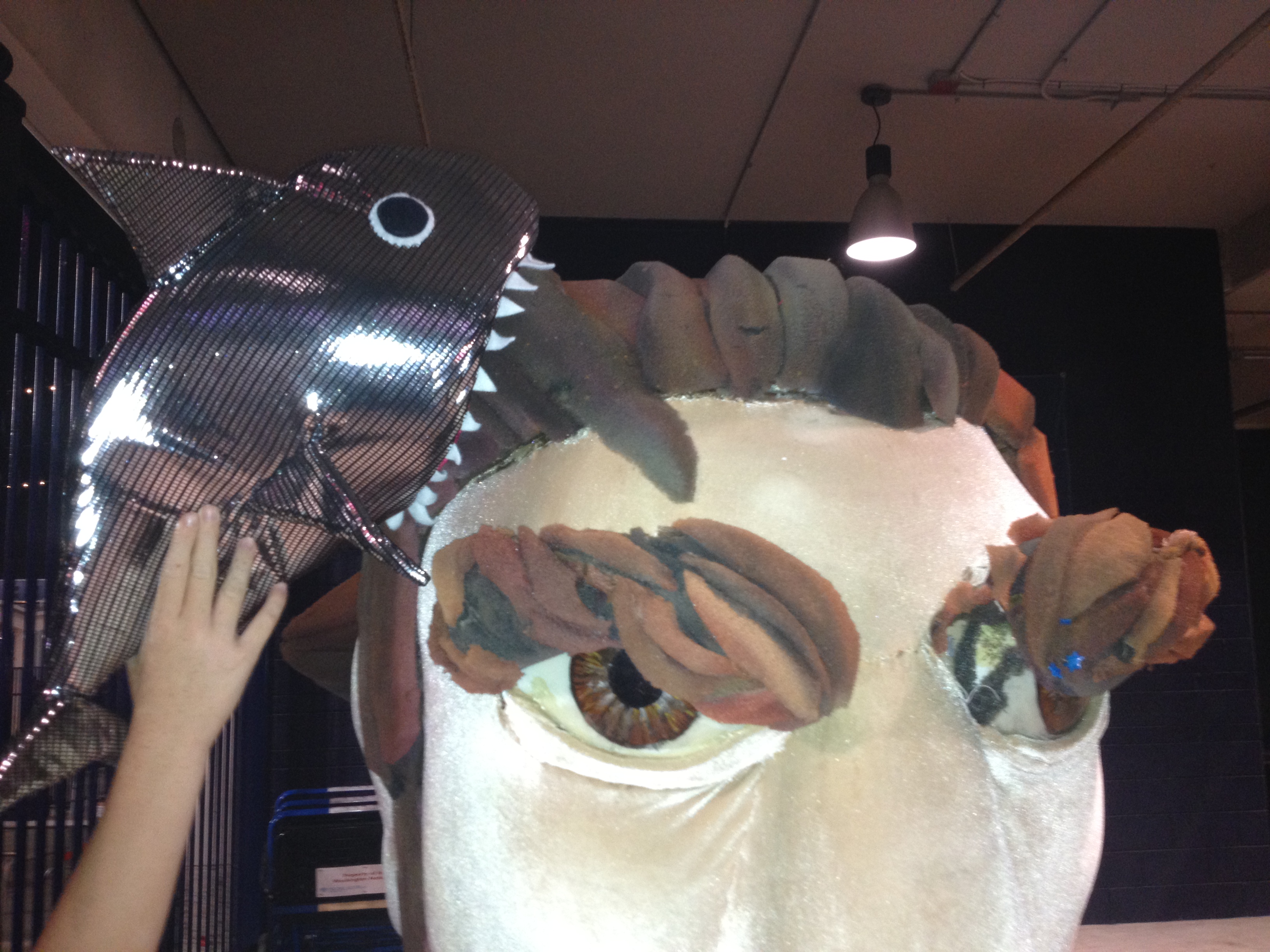 With right sides together, sew the two largest pieces of disconium together, leaving open the mouth edge and the space for the dorsal fin. Sew on the upper lip - the rounded corner should be placed where the two large pieces meet at the top of the mouth. Turn right sides out.
