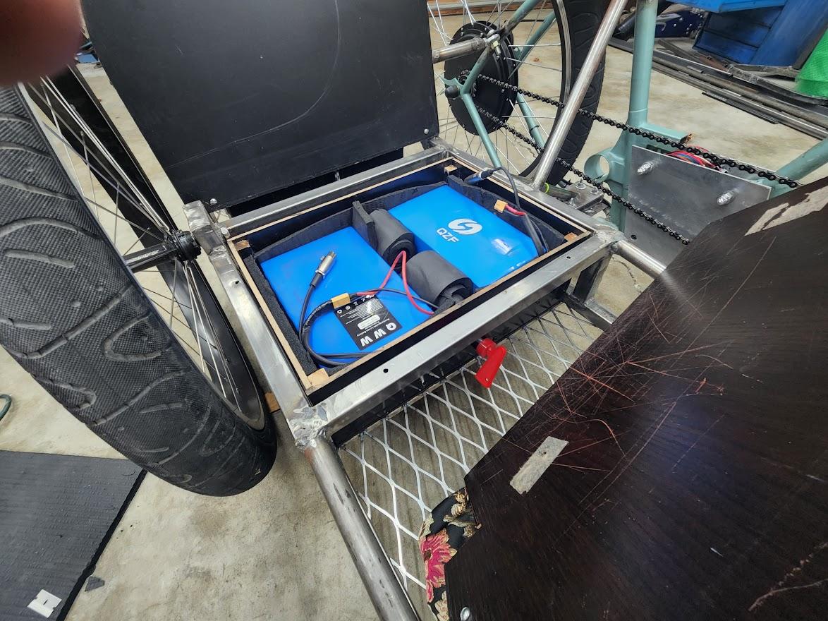 I also build the battery box out of some old press-board furniture and used an old yoga mat for padding.
