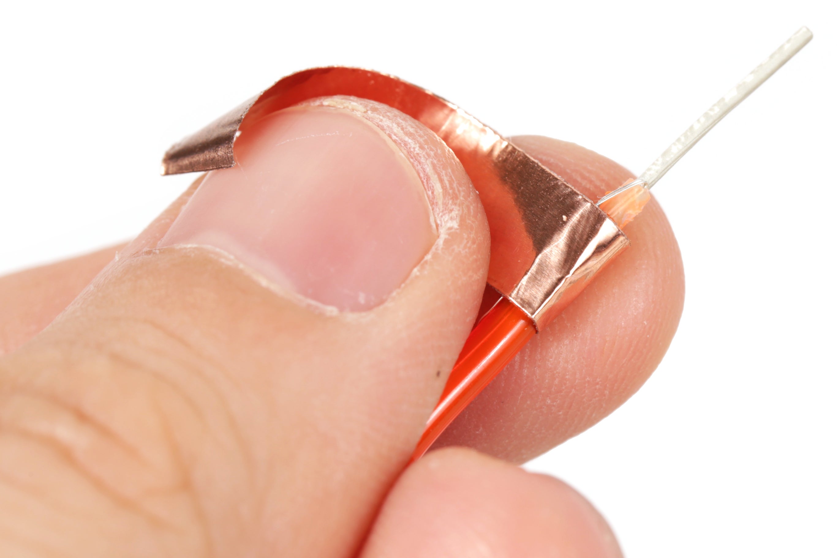 Slide a piece of shrink tube onto the wire that will get soldered to the center core, and then solder the wire in place. Solder the other wire to the copper tape.