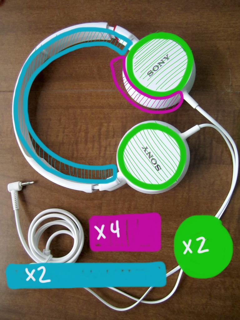 The first thing you need to do is figure out all the shapes you'll need. Look at your headphones' various surfaces and determine the shapes you'll need to cover each. For these headphones, I needed two long rectangles, four small rectangles, and two circles.