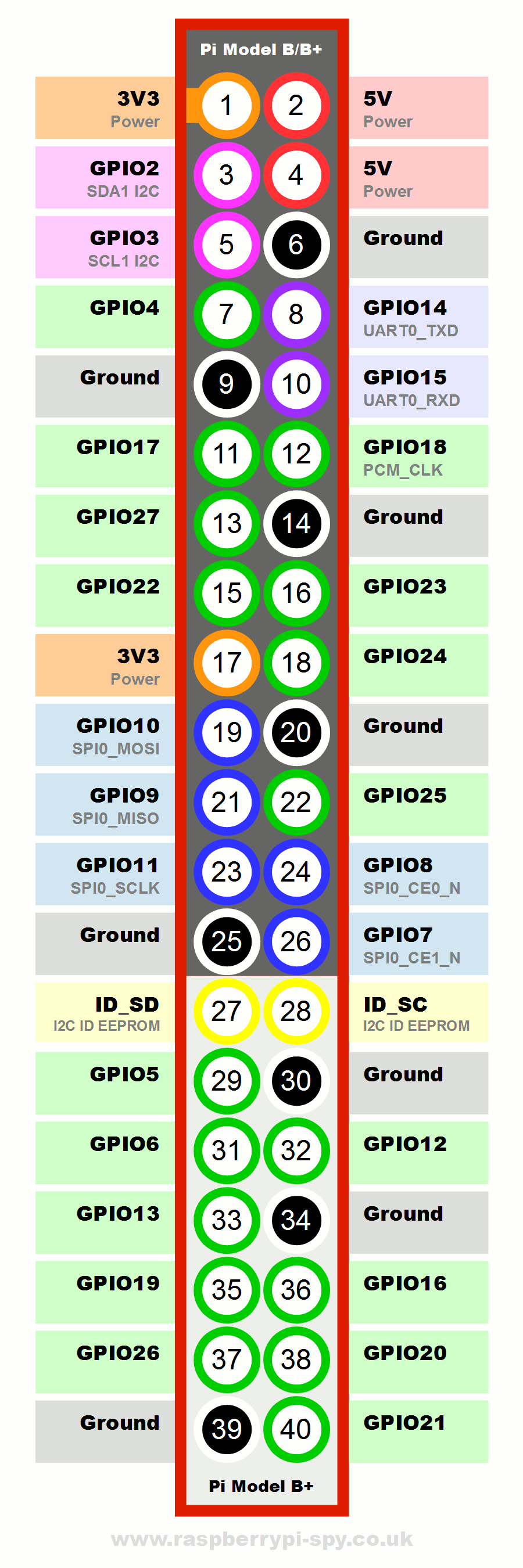 Now it’s time to connect those wires to the GPIO pins of your Raspberry Pi. Connect the wire in the ground line to a ground pin. Then connect each button jumper wire to GPIO pins, following the map below. For instance we chose here to connect with GPIO17, GPIO27, GPIO22.