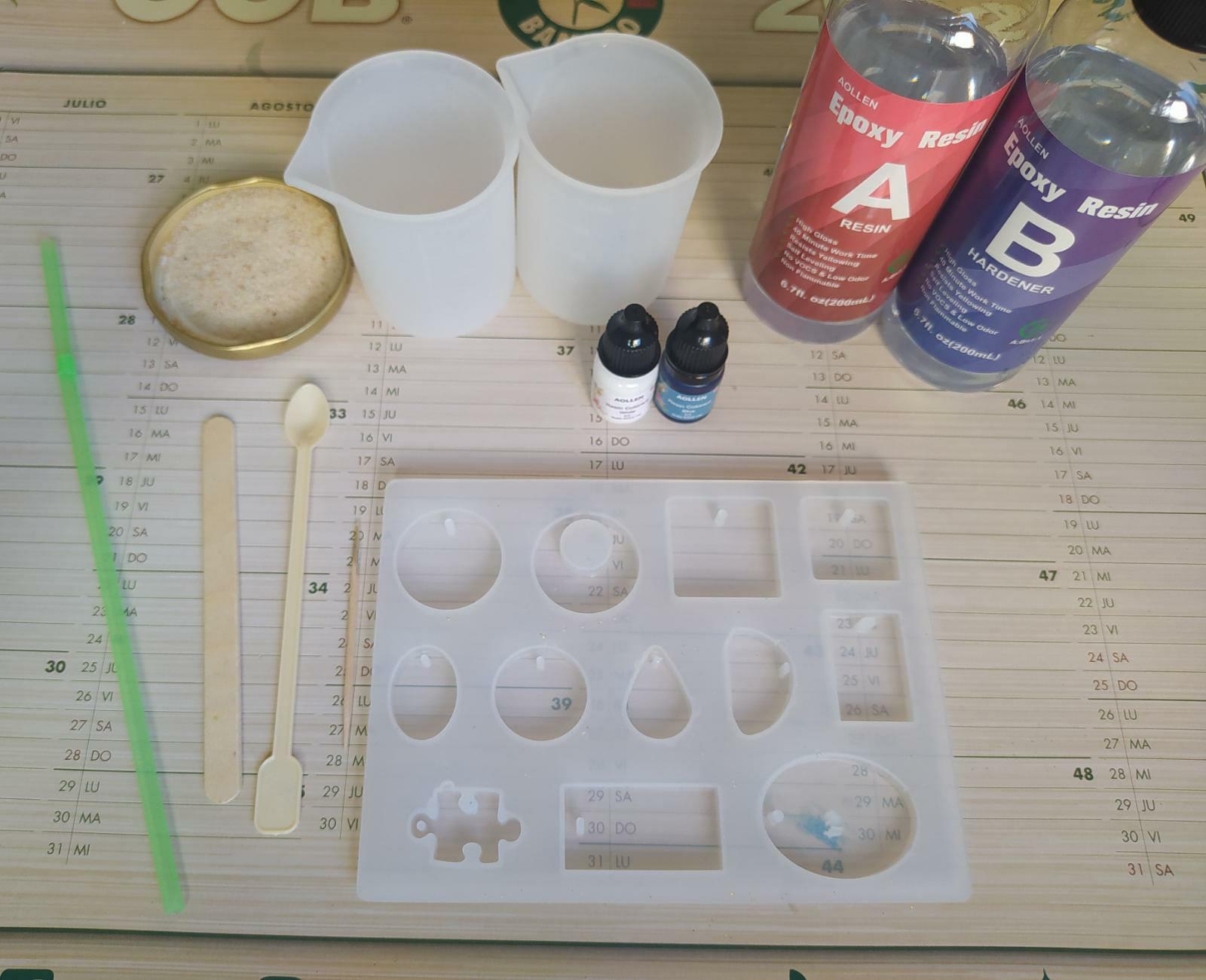 - Kit de resina epoxi (parte A y B, vasos para mezclar, moldes, colorante azul y blanco, palo para remover) https://amzn.eu/d/alC2kiK
