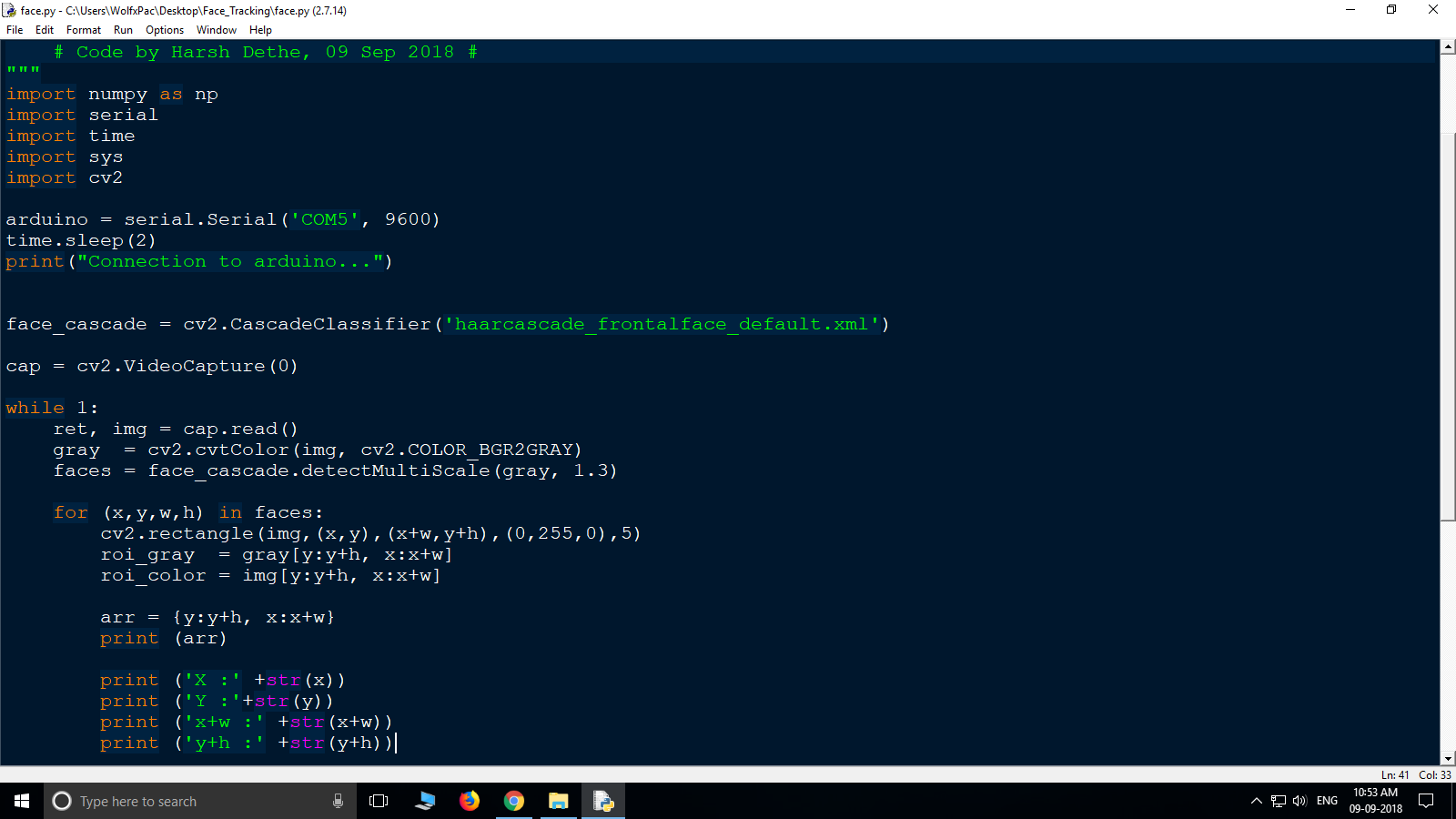 - Now open 'face.py' with Python IDLE and press 'F5' to run the code. It will take a few seconds to connect to arduino and then you should be able to see a window streaming the web cam. Now the code will detect your face and the servos will track it track it.
