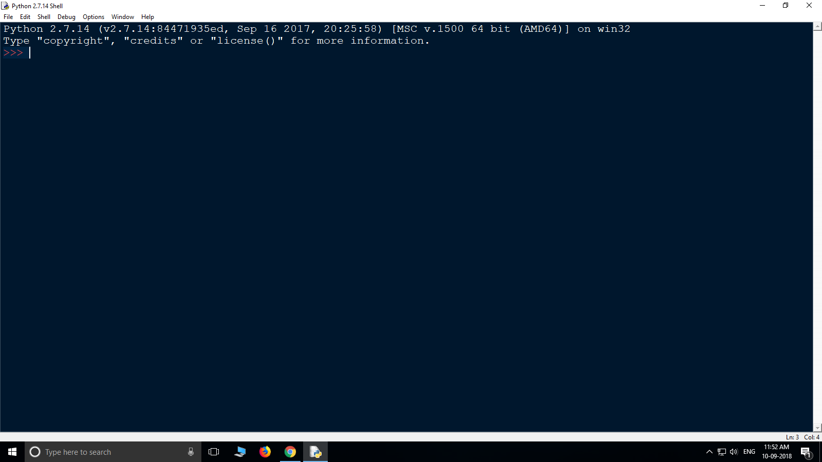 So first we need Python 2.7 up and running. To do this first download and Install python 2.7.14. To check if it is installed correctly Goto : Windows Search >> Type "IDLE" >> Hit Enter. A Python Shell should pop up.
