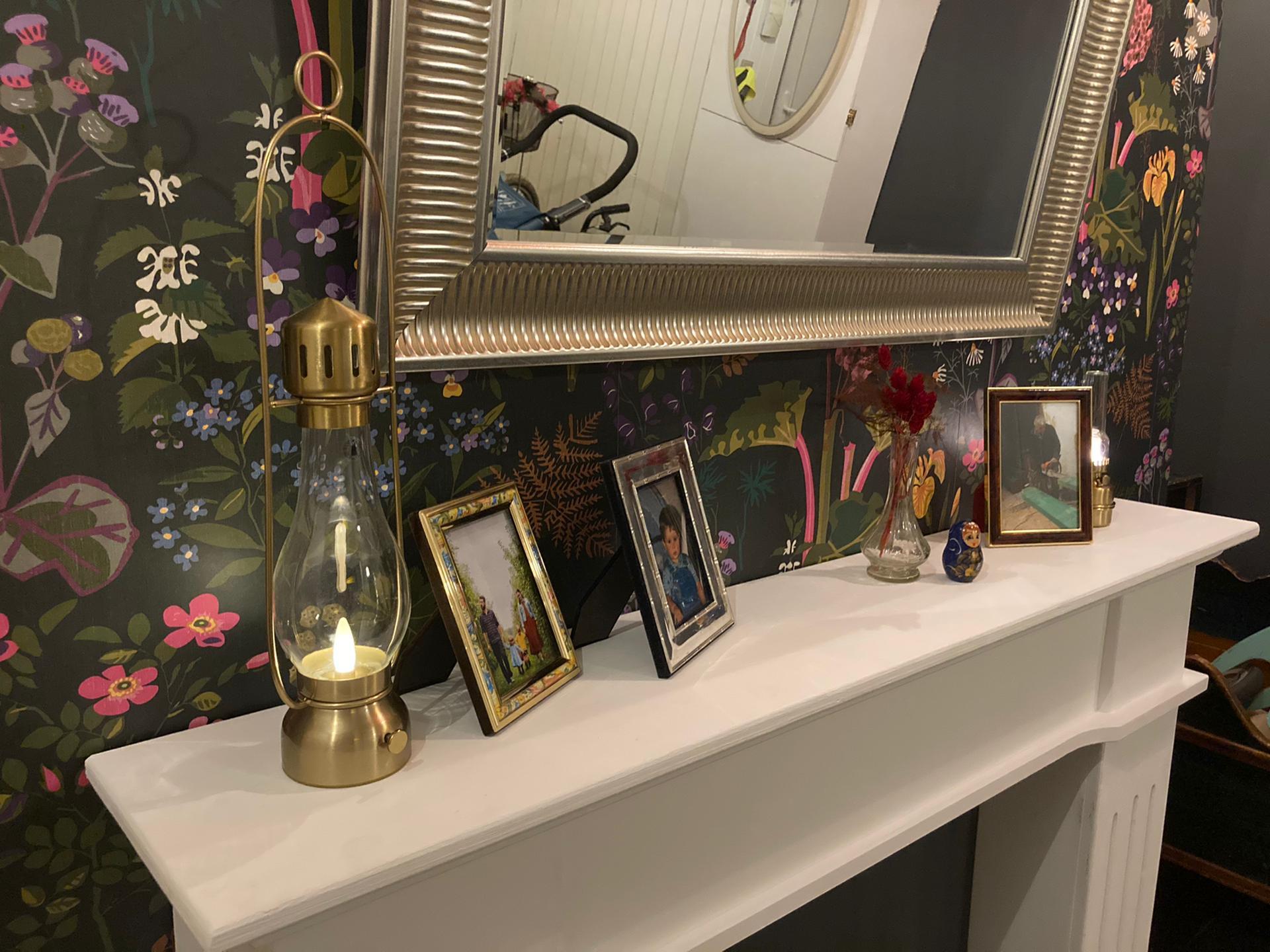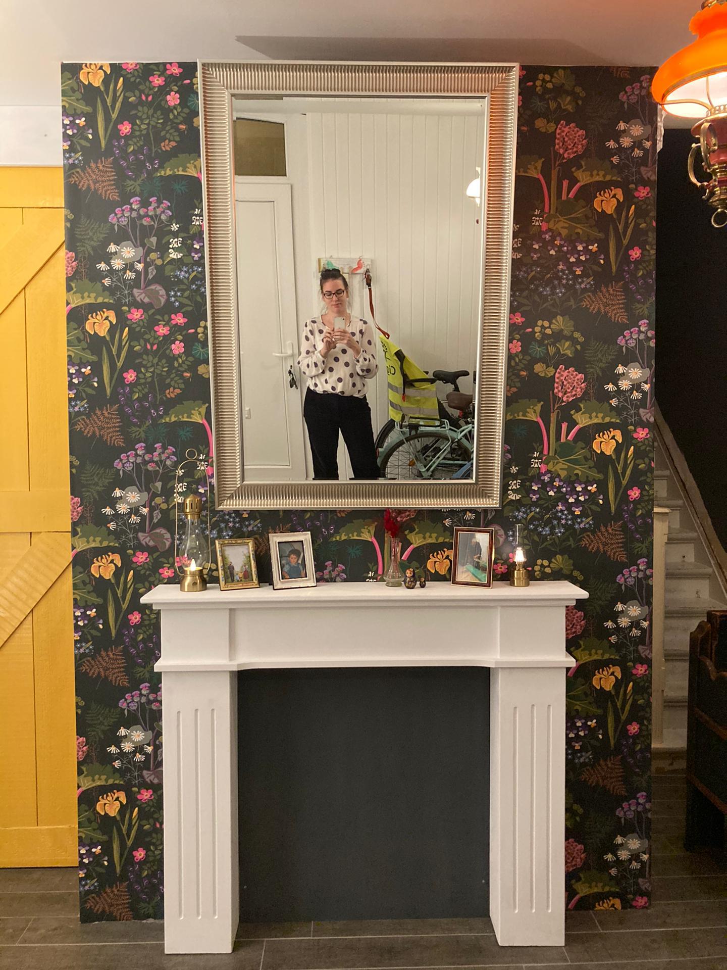 afterwords the Faky fake fireplace came back and was secured with a wood screw. Then the backer board went in and we finished it off with a Mirror on top.