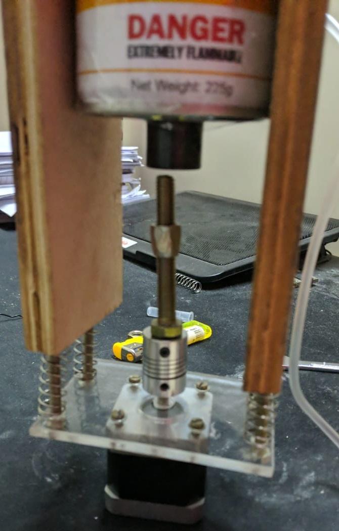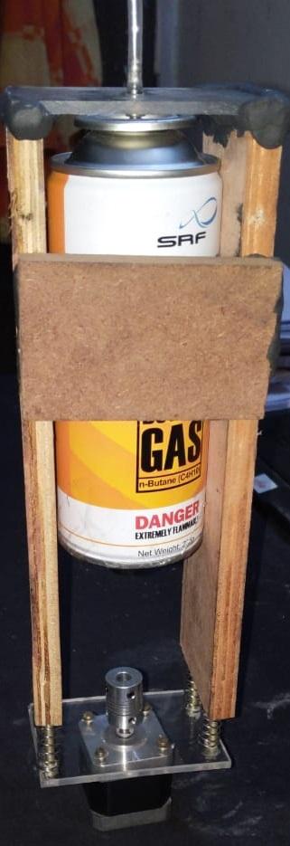 Cut two Plywood sheets about the size 1.25 Times the Size of your butane can, the extra wood below is for the stepper motor's and rod which will push against the can. Take Two small plywood's about the diameter of the butane can and drill/ nail them so that the butane can fits snug between the plywood sheets taken earlier. Now for the bottom part of the can , I found it best to take a square/ rectangular piece of plywood the size of base of the butane. Drill a centered whole and sealant /silicone a nut so that a threaded rod goes through it. Slide the Butane can into the Assembly and put an acrylic top with a centered whole drilled as well so that the nozzle of the butane can will pass / Touch it. Slide a Syringe or something similar in the top part of acrylic so that if the can presses against it the gas comes out the syringe. Connect this to the four pipes going to the four different syringes placed before the bottles. For the bottom part of the housing use screws which pass through spring 's and connect it to the wood assembly so that if the screw is tightened by the stepper the housing goes towards the stepper and makes the pressing of the Butane Can Easy.