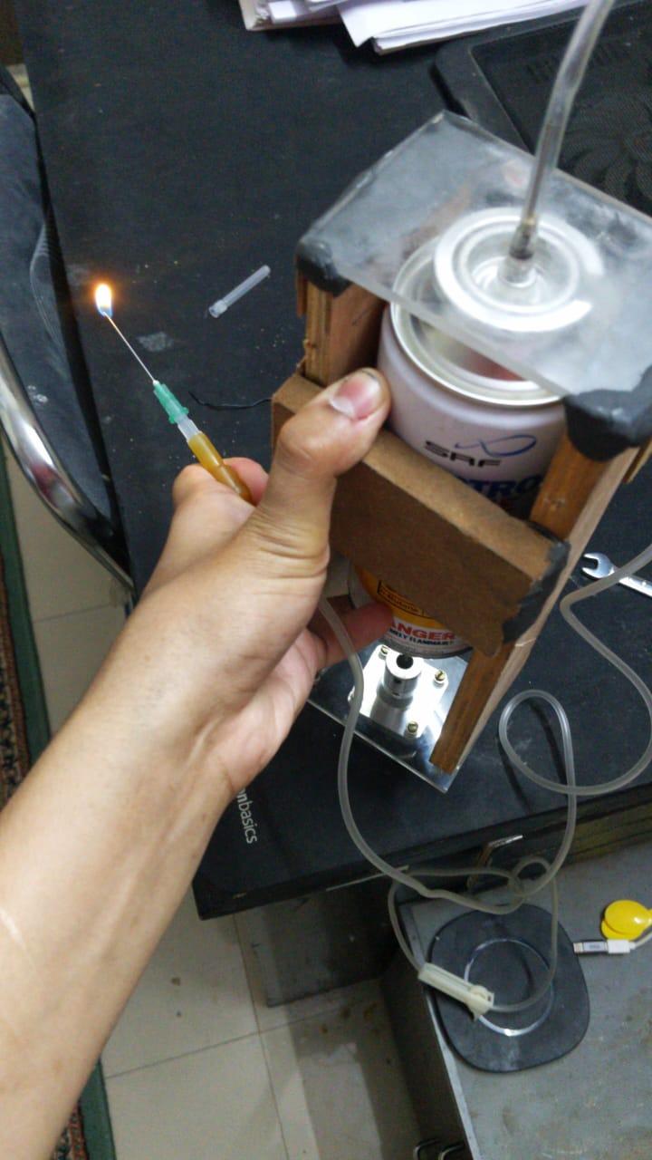 To Light up the Isopropyl a small flame directly in front of the bottle is necessary. I tried experimenting with nichrome to trigger the alcohol but sadly it does not work and even if it did there were problems I experienced with it. Moving on with the butane idea we need four small syringes and aquarium pipes. Connect all four of them to a single pipe through special adaptors / Pipe fittings. The Part Left now Is Holding the butane such that gas flows into the syringes. To Accomplish This I have made a wooden box/ Housing so that a stepper motor with a threaded screw/rod can push against the butane and keep the gas flowing.