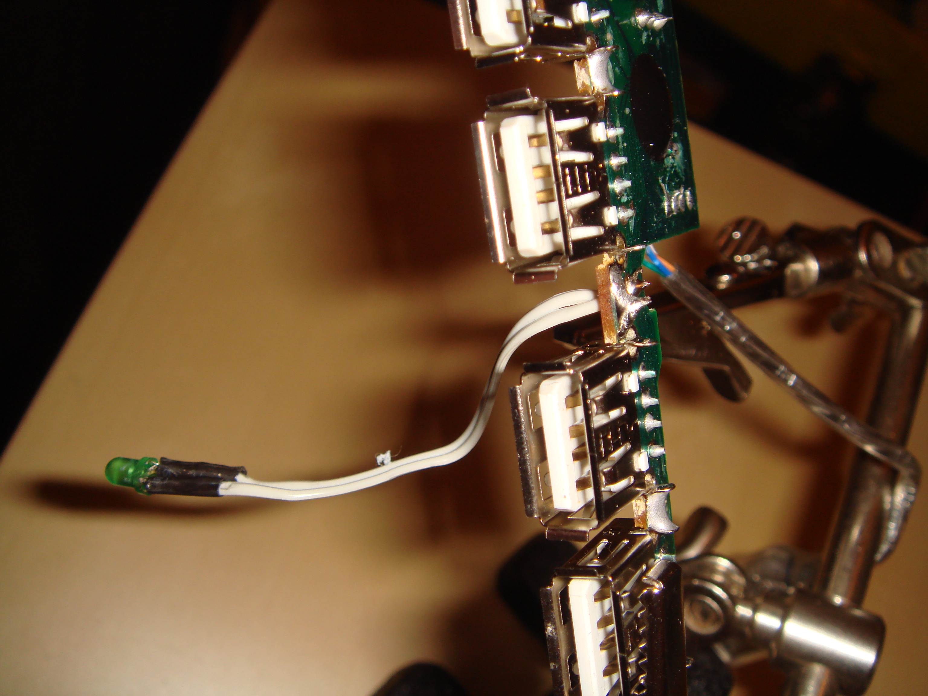 Now the testing. Before mounting all this inside I will build and test it separately. Some of your problems may include LED in the wrong way, loose connection, missing. Some of the wires were weak (which was one of my problems) so I as soon as it has been fully tested it secure the joins with a little glue with the trusty glue gun. Place some insulation tape to the bottom of the hub and the flash drive boards to stop any short circuits.
