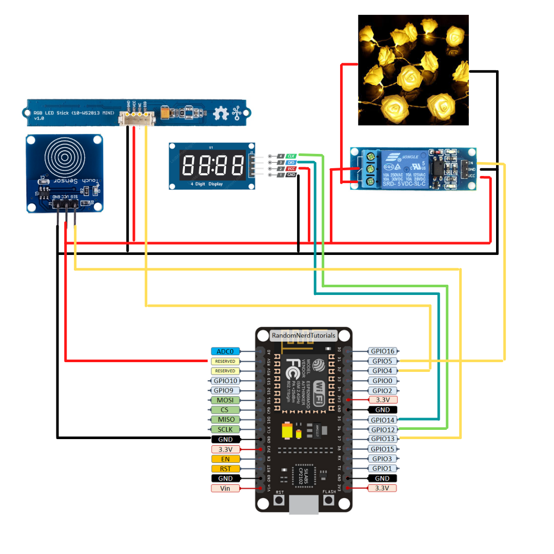 //Varaibles to change /*Get offset from <a href="https://en.wikipedia.org/wiki/List_of_UTC_time_offsets"> https://en.wikipedia.org/wiki/List_of_UTC_time_of...</a> ex: For UTC -5.00 : -5 * 60 * 60 : -18000 */ const long utcOffset = 28800; int specialDay=16; int specialMonth = 2; String monthlyMessage = "lets dance to foreber"; String yearlyMessage = "its been a happy year"; //Wifi Credentials #ifndef STASSID #define STASSID "PutYourWifiSSIDHere" #define STAPSK "PutYourWifiPassHere" #endif //Libraries to use the RGB LED Stick #include <Adafruit_NeoPixel.h> #ifdef __AVR__ #include <avr/power.h> // Required for 16 MHz Adafruit Trinket #endif #define LED_PIN 4 //Pin the RGB LED Stick is connected #define NUMPIXELS 10 //Numbers of NeoPixels are attached to the module Adafruit_NeoPixel pixels(NUMPIXELS, LED_PIN, NEO_GRB + NEO_KHZ800);// Declare our NeoPixel strip object: //Libraries to use the 7 Segment display #include <TM1637Display.h> const int CLK = 12; //Set the CLK pin connection to the display const int DIO = 14; //Set the DIO pin connection to the display TM1637Display display(CLK, DIO); //set up the 4-Digit Display. //Pin connections const int buttonPin = 13; //pin connected to the switch const int ledPin = 5; //pin connected to the relay //Other Varaibles int numCounter = 0; int buttonState = 0; // variable for reading the switch status unsigned long previousMillis = 0;// will store last time LED was updated unsigned long previousMillis1 = 0; const long interval = 40000; int pressed; String curr_min; String prev_min; //Libraries to use the Wifi #include <ESP8266WiFi.h> #include <WiFiUdp.h> const char* ssid = STASSID; const char* password = STAPSK; //Libraries to get time from the internet #include <NTPClient.h> //UTC Time const long utcOffsetInSeconds = utcOffset; char daysOfTheWeek[7][12] = {"Sunday", "Monday", "Tuesday", "Wednesday", "Thursday", "Friday", "Saturday"}; WiFiUDP ntpUDP; // Define NTP Client to get time NTPClient timeClient(ntpUDP, "pool.ntp.org", utcOffsetInSeconds); //To set Wifi Manager #include <DNSServer.h> #include <ESP8266WebServer.h> #include <WiFiManager.h> void setup() { WiFiManager wifiManager; wifiManager.autoConnect("Love Watch"); timeClient.begin(); pinMode(ledPin, OUTPUT); pinMode(buttonPin, INPUT); display.setBrightness(0x0a); //set the diplay to maximum brightness pixels.begin(); pixels.clear(); digitalWrite(ledPin, HIGH); Serial.begin(9600); timeClient.update(); String curr_min = String(timeClient.getMinutes()); if ( curr_min.toInt() < 10) { curr_min = "0" + curr_min; } String curr_time = String(timeClient.getHours()) + curr_min; display.showNumberDecEx(curr_time.toInt(), 0b11100000, false, 4, 0); } //letters aside from k,m,q,v,w,x to print text on the 7 segment display const uint8_t a = 0x77 ; const uint8_t b = 0x7c ; const uint8_t c = 0x39 ; const uint8_t d = 0x5e ; const uint8_t e = 0x79 ; const uint8_t f = 0x71 ; const uint8_t g = 0x6f ; const uint8_t h = 0x76 ; const uint8_t _i = 0x6 ; const uint8_t j = 0xe ; const uint8_t l = 0x38 ; const uint8_t n = 0x37 ; const uint8_t o = 0x5c ; const uint8_t p = 0x73 ; const uint8_t r = 0x50 ; const uint8_t s = 0x6d ; const uint8_t t = 0x31 ; const uint8_t u = 0x3e ; const uint8_t y = 0x6e ; const uint8_t z = 0x5b ; uint8_t _char = 0; const uint8_t blank = 0x00; void send_message(String message) { if (_char > message.length()) { _char = 0; } uint8_t segment; uint8_t _display [3]; for (int i = 0; i < 4; i++) { switch (message.charAt(_char + i)) { case 'a': _display[i] = a; break; case 'b': _display[i] = b; break; case 'c': _display[i] = c; break; case 'd': _display[i] = d; break; case 'e': _display[i] = e; break; case 'f': _display[i] = f; break; case 'g': _display[i] = g; break; case 'h': _display[i] = h; break; case 'i': _display[i] = _i; break; case 'j': _display[i] = j; break; case 'l': _display[i] = l; break; case 'n': _display[i] = n; break; case 'o': _display[i] = o; break; case 'p': _display[i] = p; break; case 'r': _display[i] = r; break; case 's': _display[i] = s; break; case 't': _display[i] = t; break; case 'u': _display[i] = u; break; case 'y': _display[i] = y; break; case 'z': _display[i] = z; break; default: _display[i] = blank; break; } } display.setSegments(_display); _char ++; } void loop() { unsigned long currentMillis = millis(); timeClient.update(); curr_min = timeClient.getMinutes(); if ( curr_min.toInt() < 10) { curr_min = "0" + curr_min; } String curr_time = String(timeClient.getHours()) + curr_min; unsigned long epochTime = timeClient.getEpochTime(); struct tm *ptm = gmtime ((time_t *)&epochTime); int monthDay = ptm->tm_mday; int currentMonth = ptm->tm_mon + 1; if ( curr_min != prev_min) { prev_min = curr_min; Serial.println(curr_time); display.showNumberDecEx(curr_time.toInt(), 0b11100000, false, 4, 0); } if (currentMillis - previousMillis1 >= 500) { previousMillis1 = currentMillis; if (curr_time == "000") { if (monthDay == specialDay && currentMonth == specialMonth) { send_message(yearlyMessage); } else if (monthDay == specialDay) { send_message(monthlyMessage); } } if (curr_time == "2311") { for (int i = 0; i < NUMPIXELS; i++) { pixels.setPixelColor(i, pixels.Color(255, 0, 127)); pixels.show(); } send_message("good nyt "); //change this message using small letters letters aside from k,m,q,v,w,x } else if (curr_time == "630") { for (int i = 0; i < NUMPIXELS; i++) { pixels.setPixelColor(i, pixels.Color(0, 0, 0)); pixels.show(); } send_message("ganbate");//change this message using small letters letters aside from k,m,q,v,w,x } else if (curr_time == "930") { send_message("hi");//change this message using small letters letters aside from k,m,q,v,w,x } else if (curr_time == "1159") { send_message("lets eat "); //change this message using small letters letters aside from k,m,q,v,w,x } else if (curr_time == "1830") { send_message("lets eat"); //change this message using small letters letters aside from k,m,q,v,w,x } else if (curr_time == "959") { send_message("gud nyt ");//change this mess