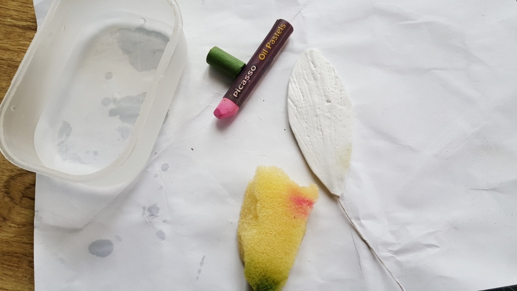 Rub the green on to your sponge. now apply some color at the bottom and a bit at the sides of the petal. Dip sponge in water to blend in the color. Add some pink at the back at the bottom edge. If you need more lines...at this point you can add some with the blunt edge of a exacto knife. Now for shaping it. I've added a video in the next step to better explain how it's done.