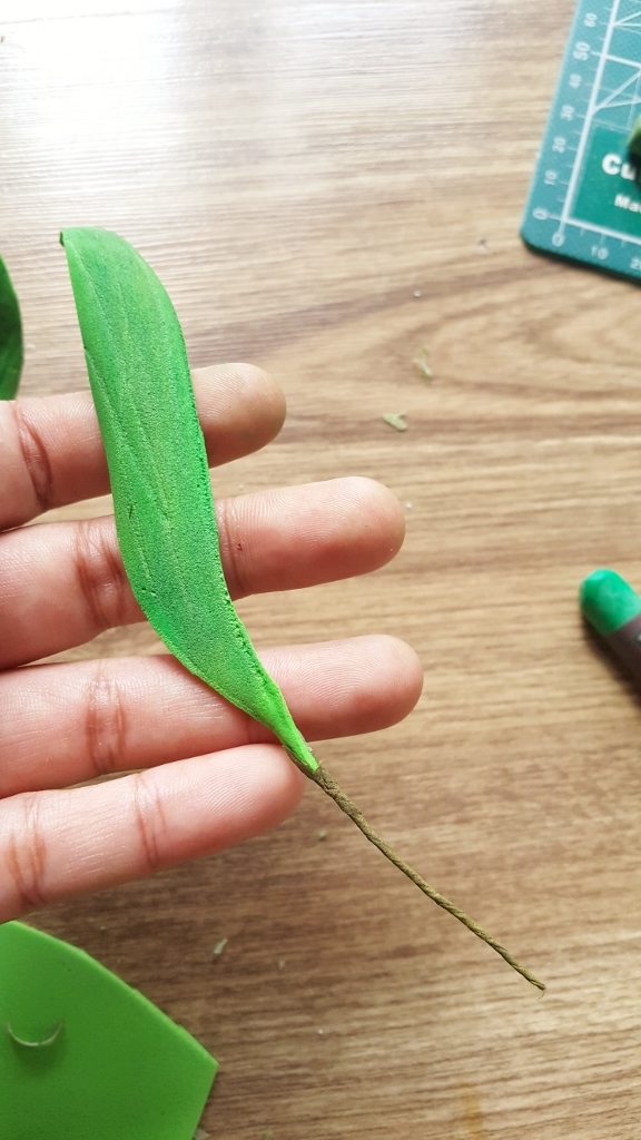 Wrap some floral wire in green. glue it to the the leaf with super glue. Now wrap again with green floral tape joining the bottom edge of the leaf.