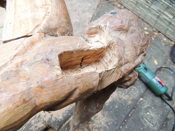 Oak is very hard and goes a lovely orange colour. Here you can see a post in its raw form as it was found. It is being fitted to extend the carved gargoyle to add an arm-rest support. Although it may not look like it, the carved creature is made from exactly the same wood as the post.