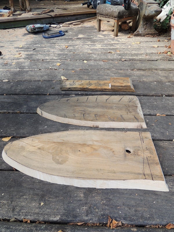 This log was distorted because it was from the shoulder of a branch of the original tree. It was used to make arm-rests. You can see saw marks. These are from a circular saw. This was the only saw I had to hand.