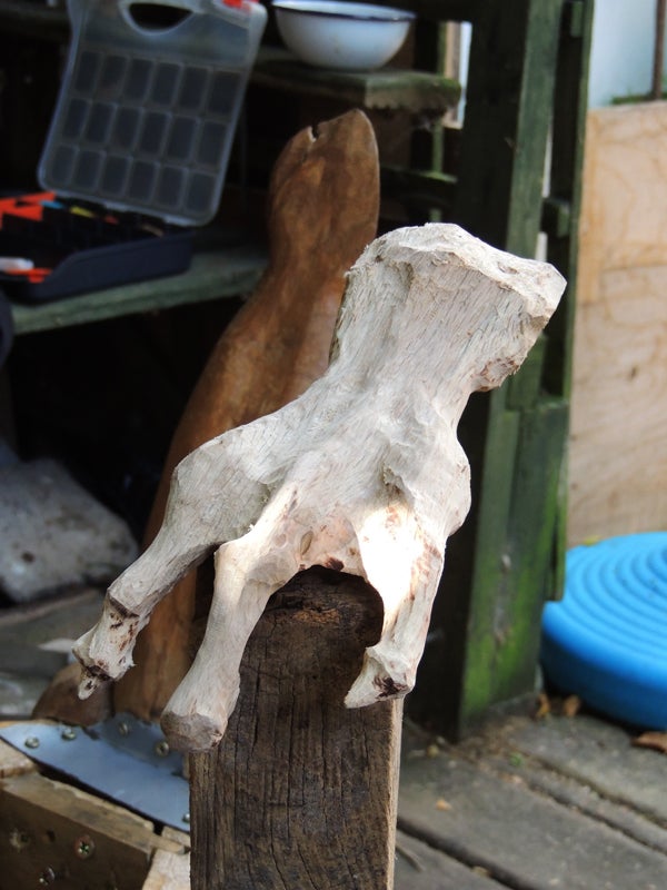 - Reclaimed oak floor board or wall panel offcut - the carved skeletal back was made by gluing together jigsaw cut layers of this into a boat shape then carving it.