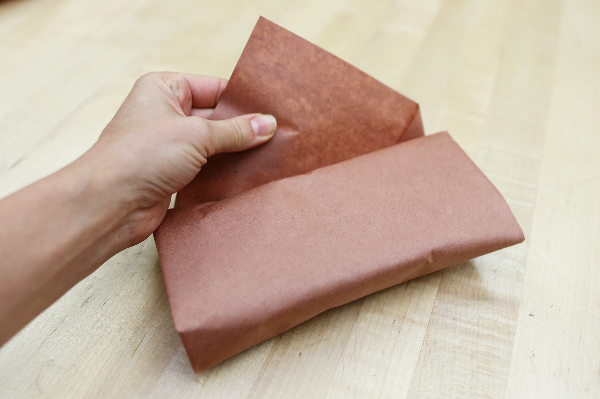Place the wrapped fillet diagonally in the corner of the paper square and fold up the corner.