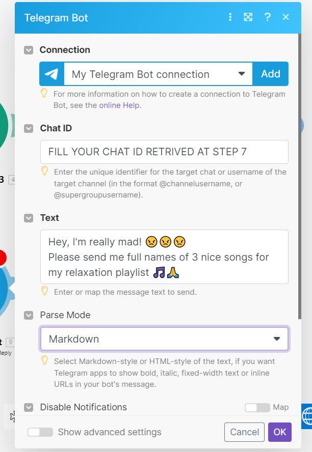2. Click on the Telegram module, choose Add and under Connection field choose your already configured Telegram connection. Click OK to save your settings.