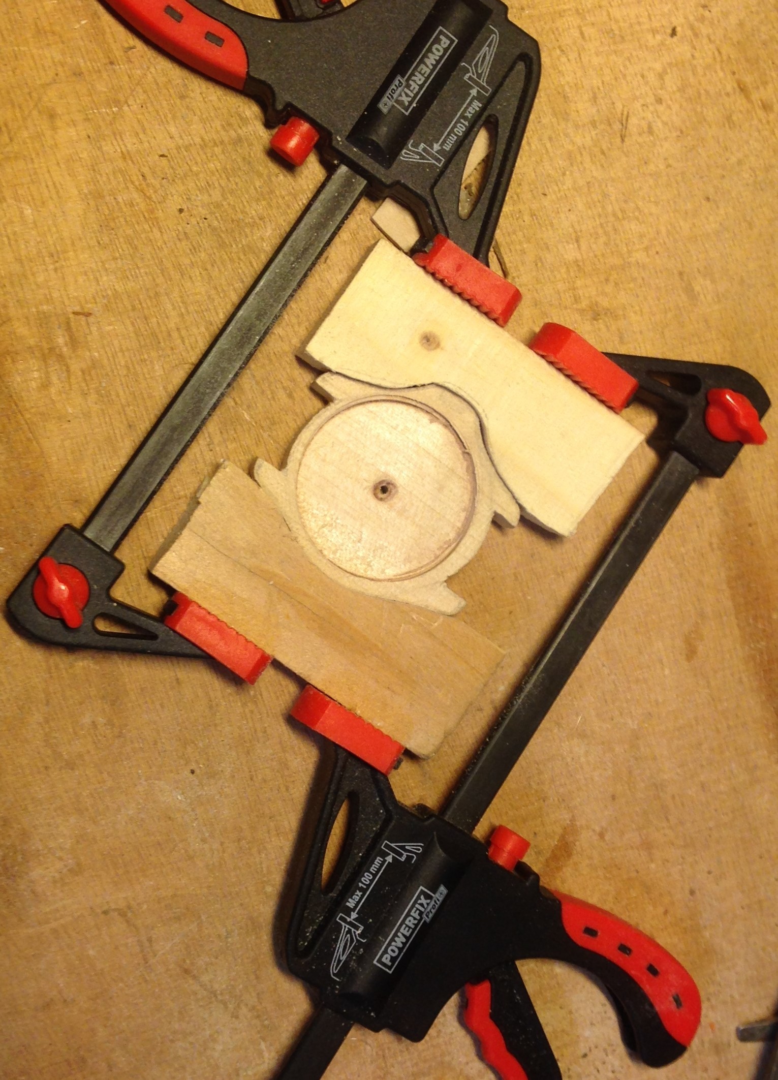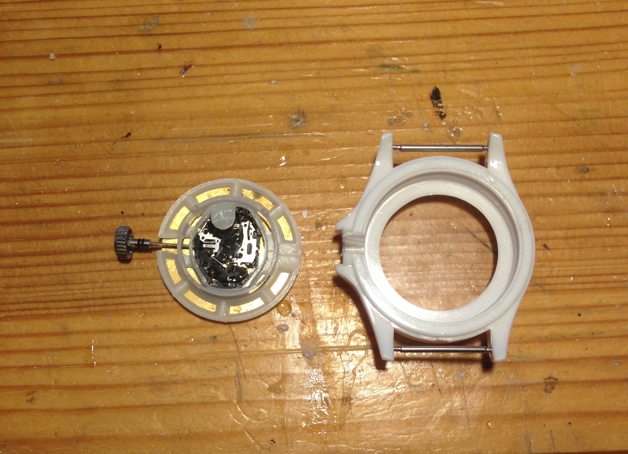 For the bandsaw cuts you want to have at least two straight sides. In order to get them, stabilize the wood with glued-on extra pieces (hot glue). Then make the first cut. Now you can create a 90° angle and slice the wood. Trace the outline and cut it out with a fretsaw, but before drill one big hole and one smaller one in the middle. I first sawed it out and build a bracket to hold it, the better way would be drilling first and sawing after that. Take away a few millimetres from the top and leave a ring and bevel it Drill a hole and saw a ring out. Sand it so it fits around the beveled ring. I just used the snap mechanism for the back from the original watch. Later, I filled the gap with glue (I used installation glue which doesn't shrink while drying). Also drill a hole where the winder is going to be.