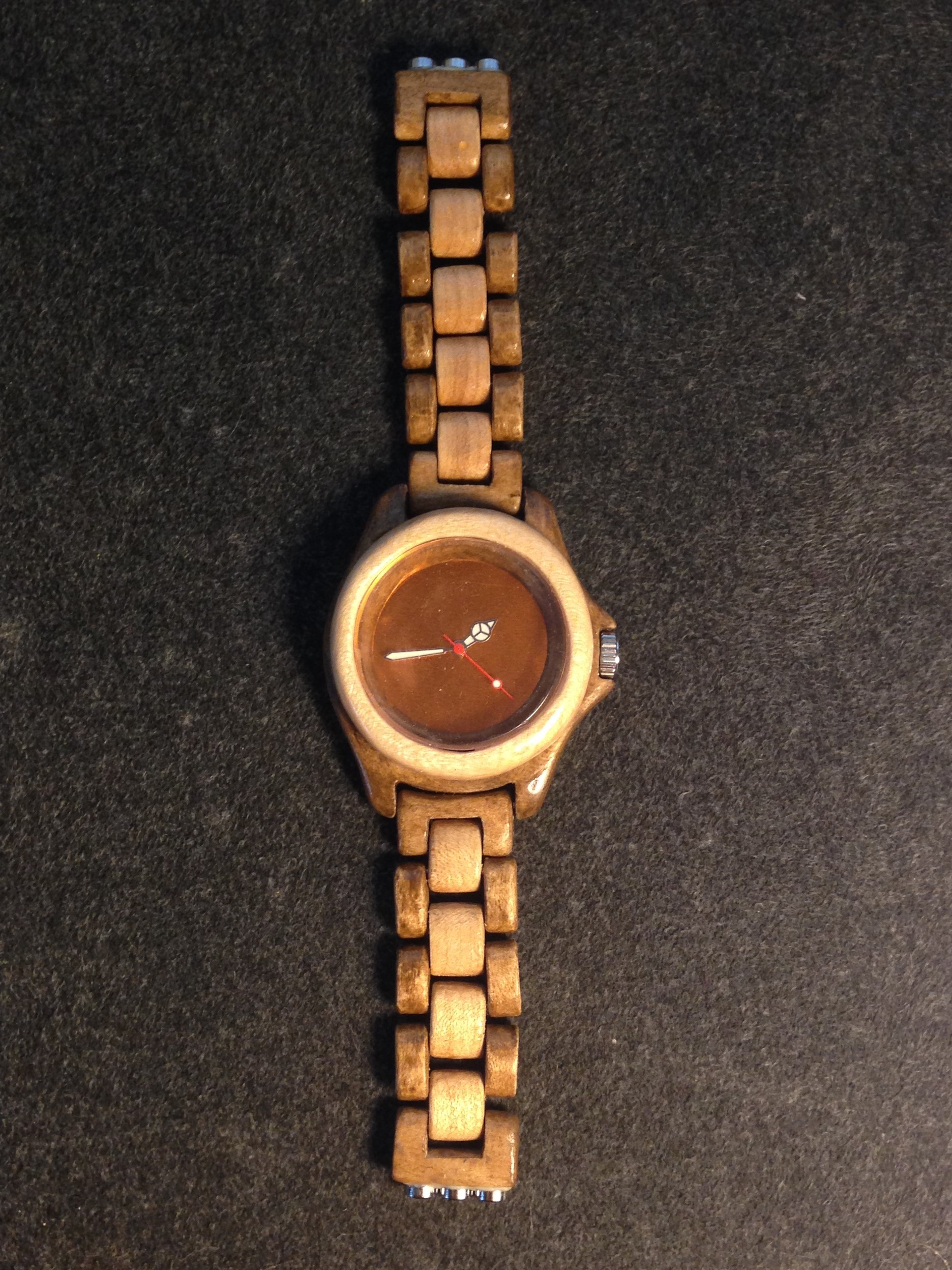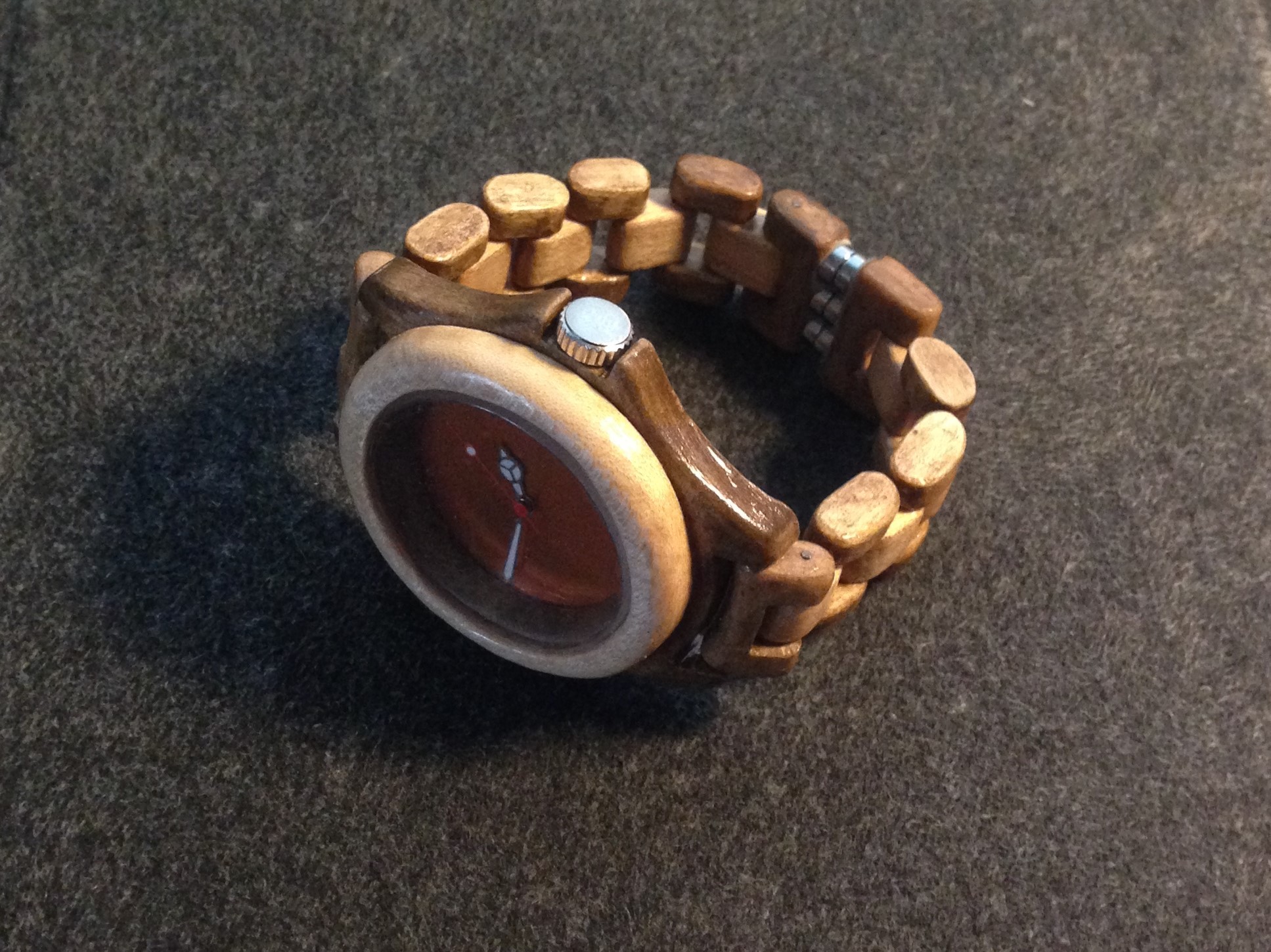 Since I only used one type of wood it looked not very special, so I brought in some contrast with glaze. I applied a linseed oil-wax mixture wherever i didn't use the walnut glaze. After that, I painted everything with clear varnish. The parts which connect the band with the watch are held in place with spring bars. I drilled the holes with my hand-made tool. The clasp consists of two wood pieces and 3 magnets per side. I did not expect the magnets to be so strong, but now I will never lose the watch. For the clock face I chose cooper foil. The hands were very simple to remove because they were just stuck on. I sanded off the original face and used super glue to install the new one. In the metal back-cover I put a piece of paper so the clockwork isn't wiggling back and forth. I also sanded off the adverisement logos from the cover and the winder and polished it afterwards.