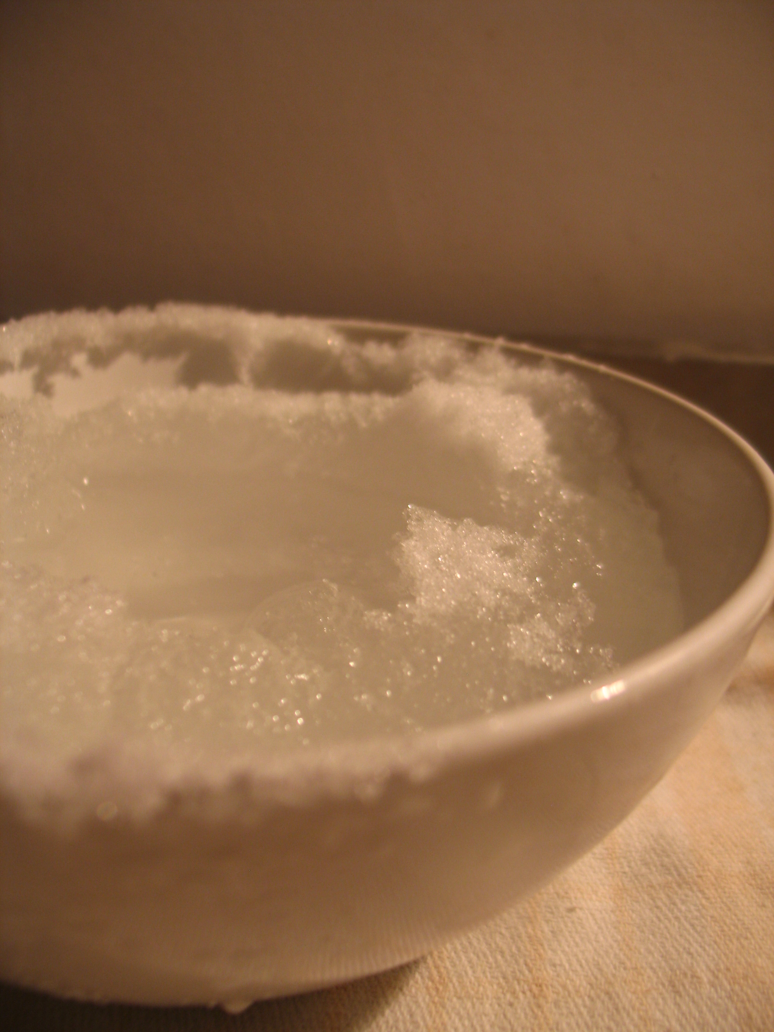 I didn't have a candy thermometer or ice so I went and got some snow and poured water in the middle of it. In the second picture you can see some little hard balls in my snowater.