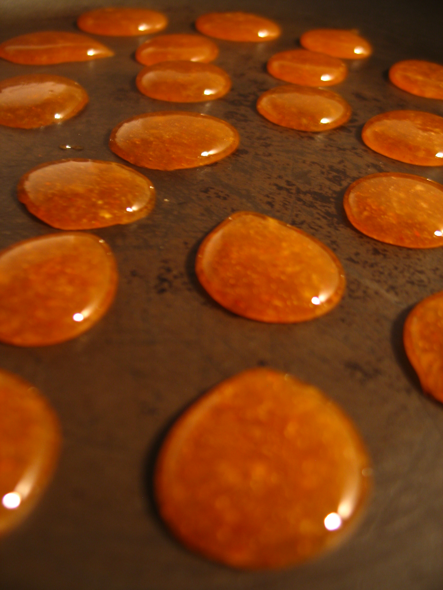 Now your part in lozenge making is almost done. With the honey/sugar/cayenne mixture cooled for 5 minutes and the citrus zest/garlic/ginger/salt mixed in you can start pouring the mixture onto your non-stick surface. Drop 1/2 teaspoons of the mixture onto your nonstick surface, making sure to leave some space between the drops (because they spread a bit). I couldn't find a silicone mat, parchment or wax paper so I just used 2 non-stick frying pans.