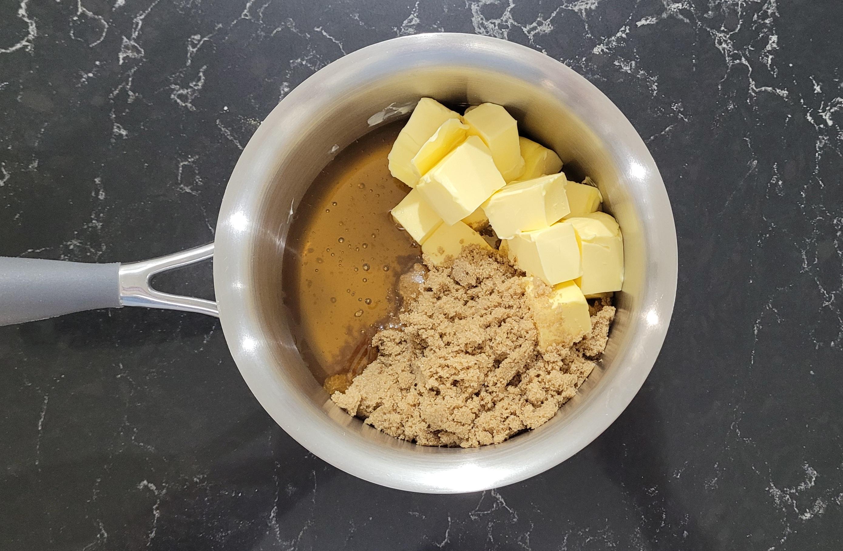 -To make your Gingerbread, add your honey, brown sugar, and butter to a small saucepan