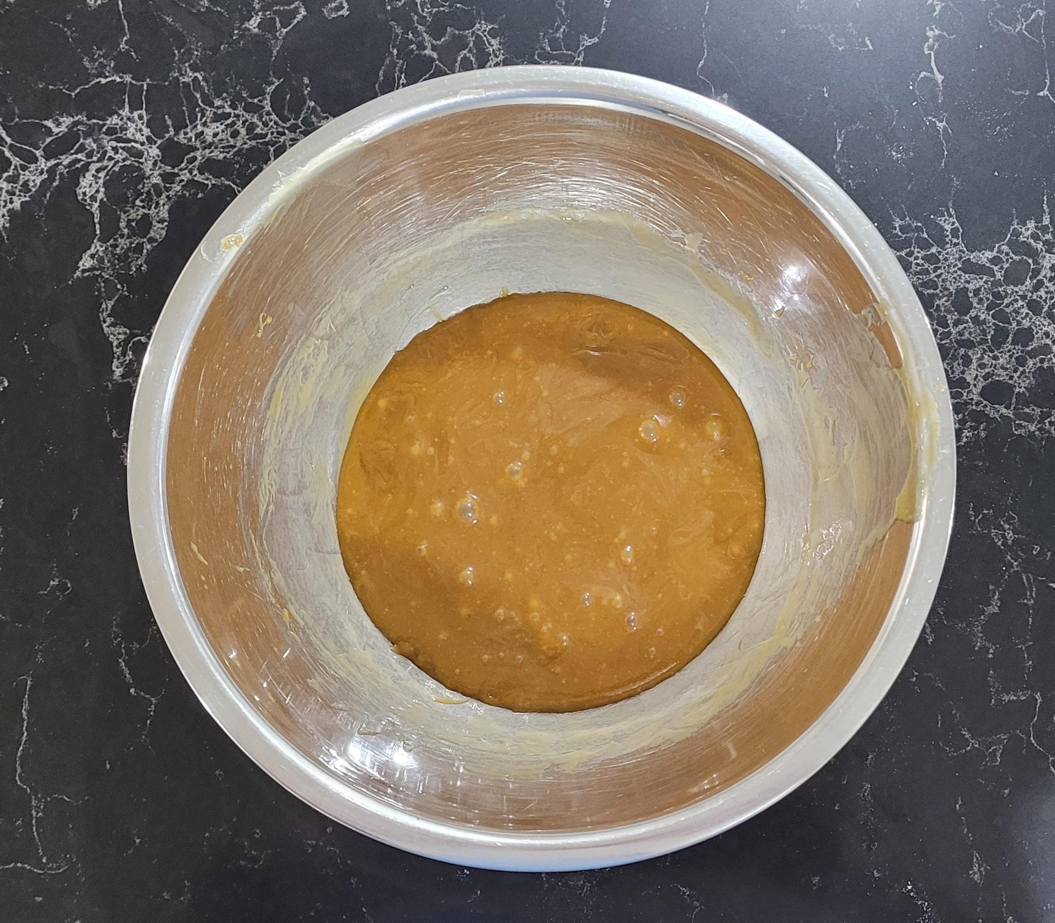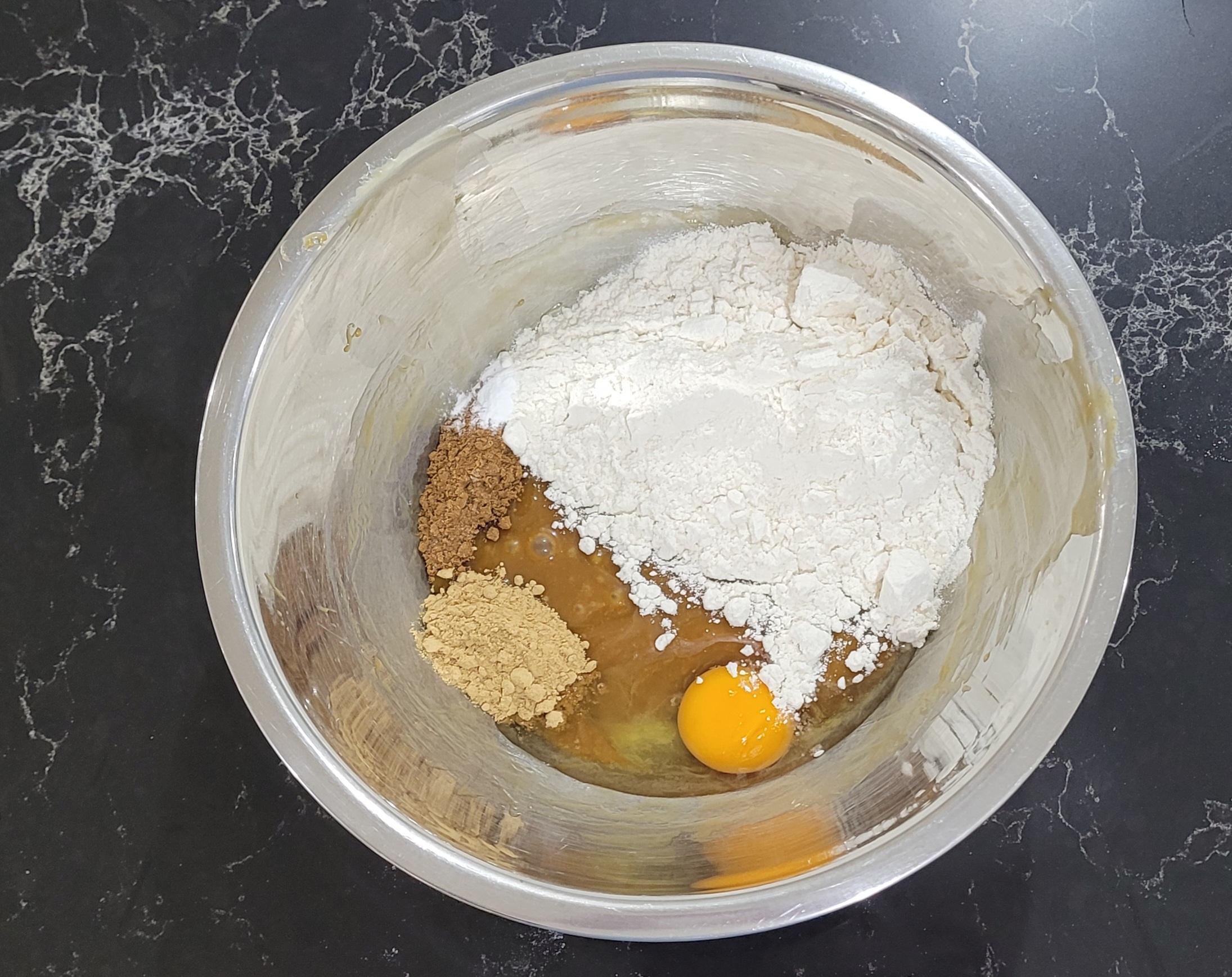 -Once your mixture has cooled, add your flour, egg, ginger, baking powder and allspice.