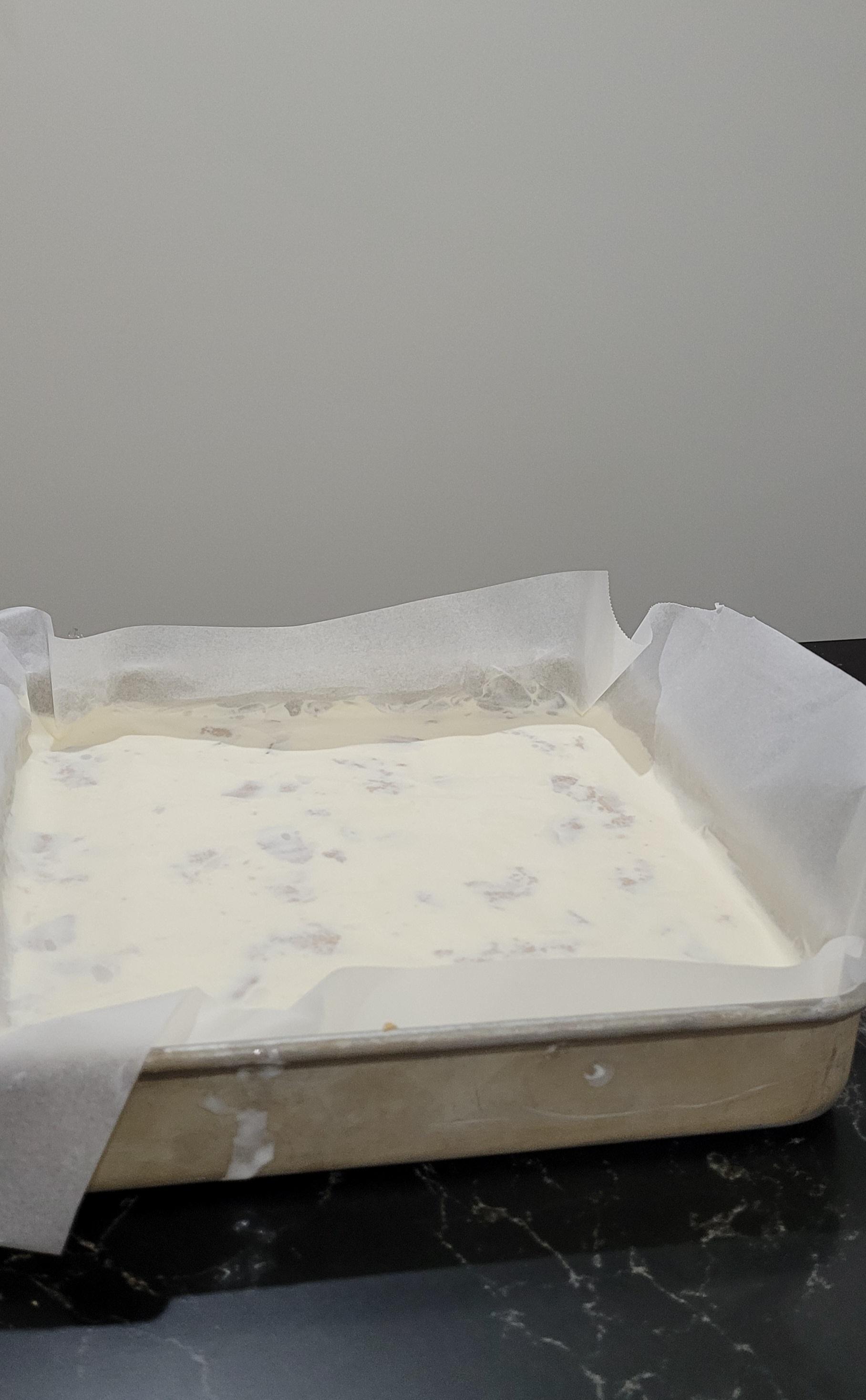 -Repeat this until all of your icecream had been used, smooth out the surface with a spatula. Cover with baking paper and set aside in the freezer for 5-6 hours (ideally over night)