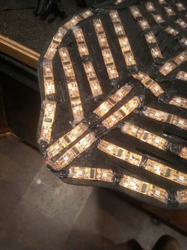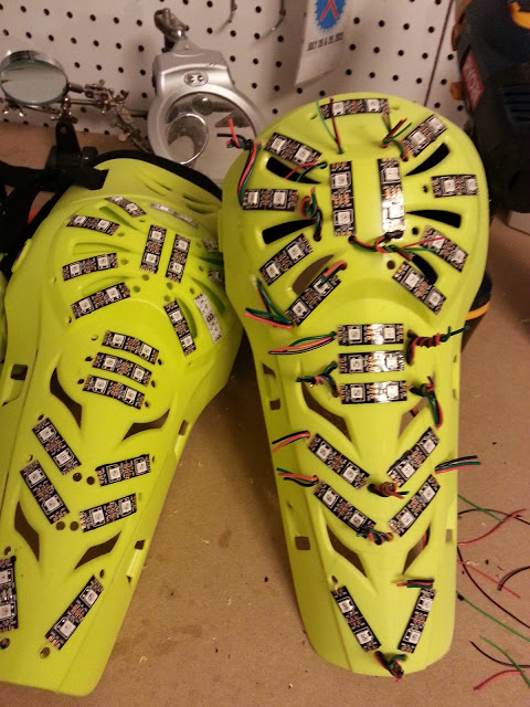 On the picture of the knee pads in this picture you can see holes each end of each segment. The segment connector wires where soldered to the end of one segment, then ran through a hole to the back, and back through the next hold to the front and attached to the next segment. This process does give a very clean look, but it takes A LOT of time, and an equal amount of patience with the soldering process. I would only suggest this if it's crucial to complete hide the wiring and if your comfortable with soldering.