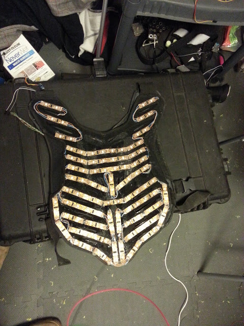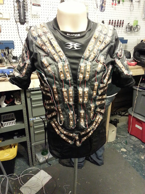 The second version of this suit I made used a hard shell vest for the top. There ended up being a few reasons this worked MUCH better then the first top. Firstly, the harder surface made it MUCH easier to mount and wire up the individual LED sections. Because of it's sturdiness the LEDs really didn't flex hardly at all when being worn. This drastically reduced the likely hood of a strip getting damaged. The third big improvement using this type of vest was in the overall design and the way it's intended to be taken on and off. The first top had to be put on delicately and over my head just like any other shirt. This vest allowed the straps across each side to be un-clipped and easily pulled right off over your head. Again, much less potential for damage to the strips and a lot quicker time getting in and out of the suit.