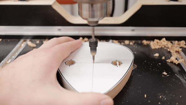 Next, I used my drill press to drill 1/2" holes for the pipe, as well as a countersunk hole for the screw that would attach this hanger to the wall. The thing I like about using a template is that no measuring is required!