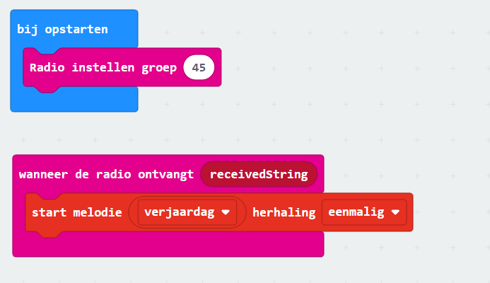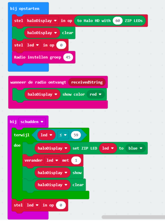 De tweede microbit is degene die aan de deur hangt. Deze is verbonden met een ledring die aan gaat op het moment dat deze een signaal krijgt van de microbit1 die Berta rond haar arm heeft hangen.