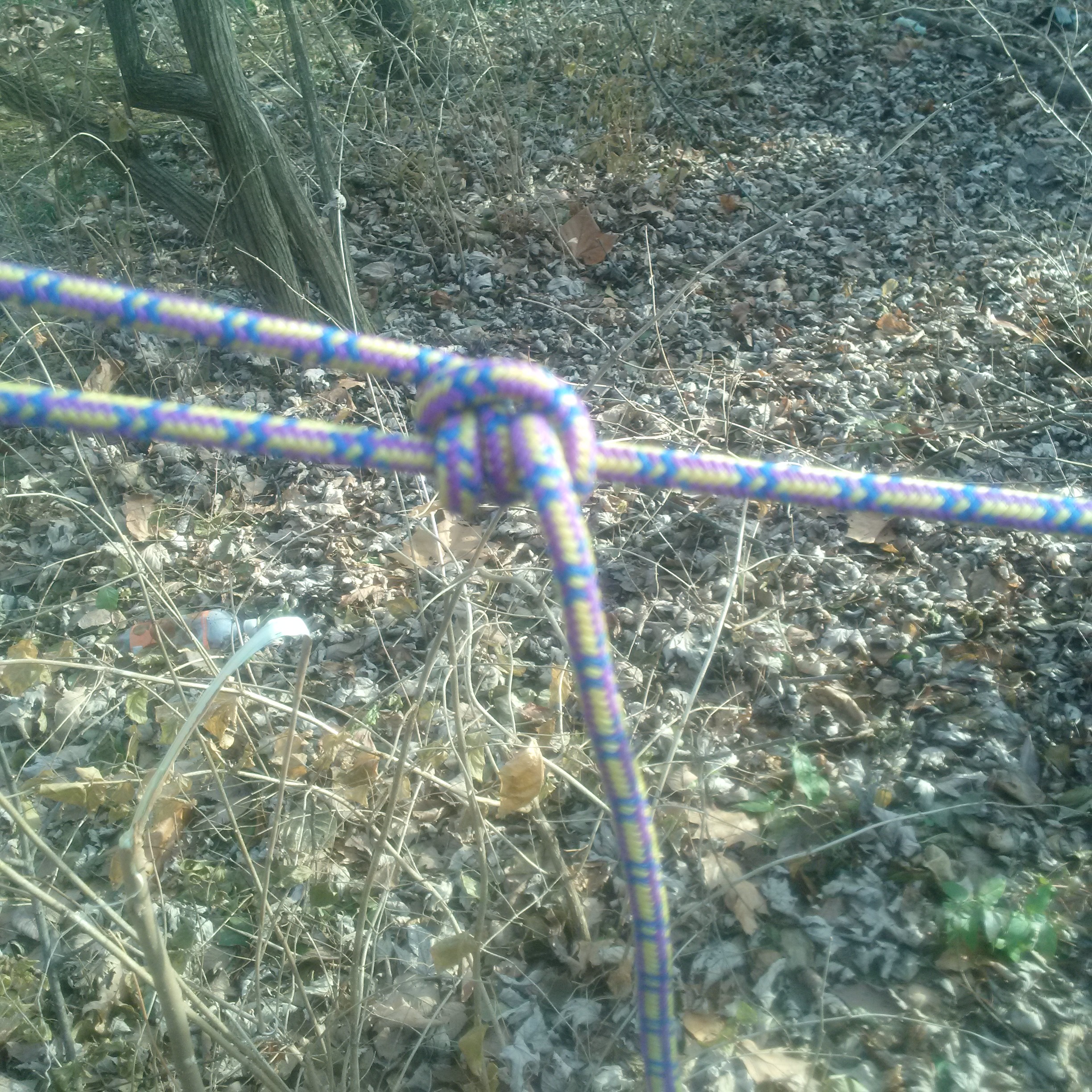 The anchor point has a taut line hitch to hang the hammock and allow for adjusting tension on the hammock.