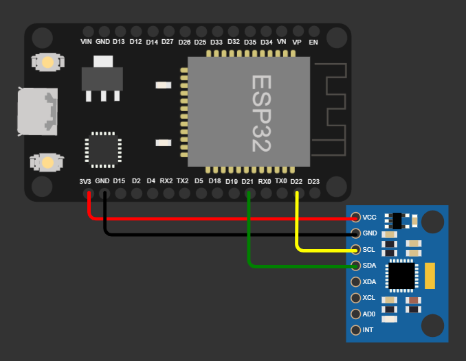 - Connect the MPU6050 sensor module to the ESP32 module using jumper wires. You will only need to connect four pins of the MPU6050 module for this project, which are: