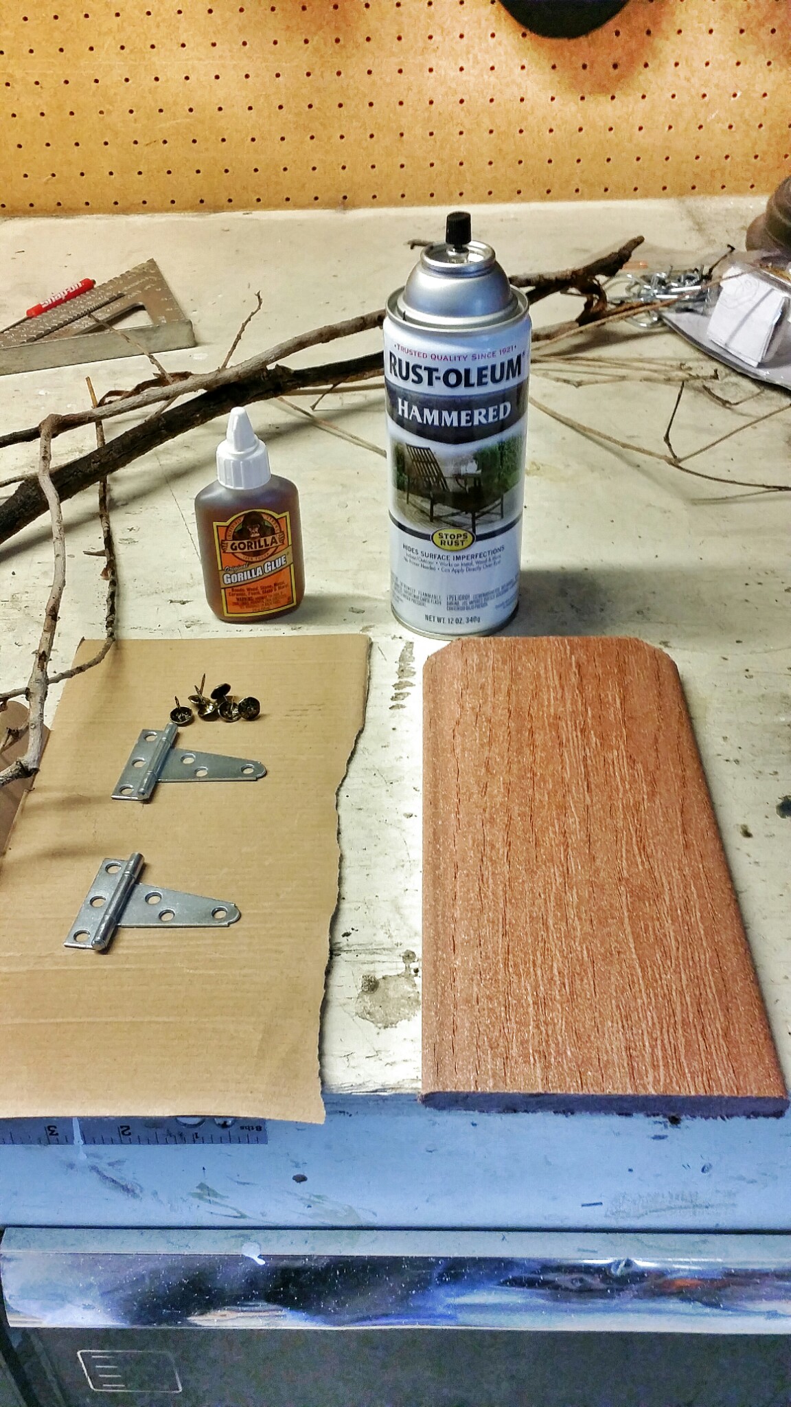 I found a thin 5' piece of composite deck material in the cut-off bin for $3, then went to hardware and found the smallest gate-type hinges I could. I figured some hammertone paint would give them an appropriate finish. Next up was something that looked old-timey for hinge bolts - some antique brass thumbtacks fill the bill just fine.