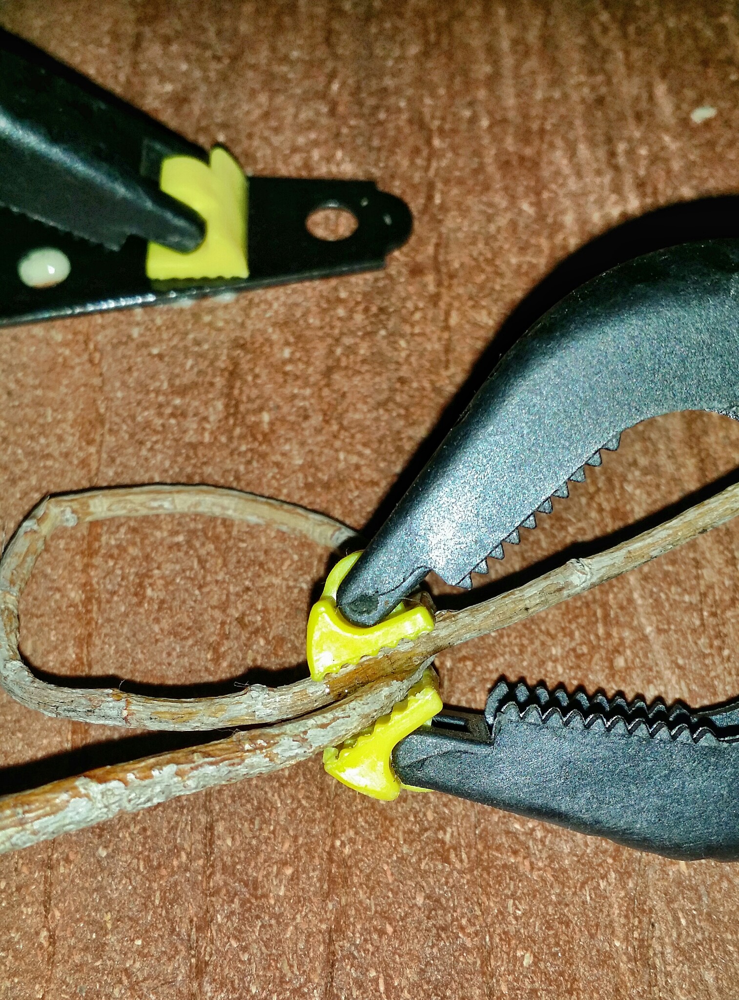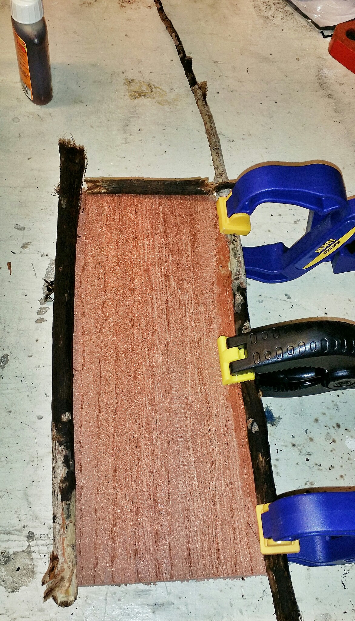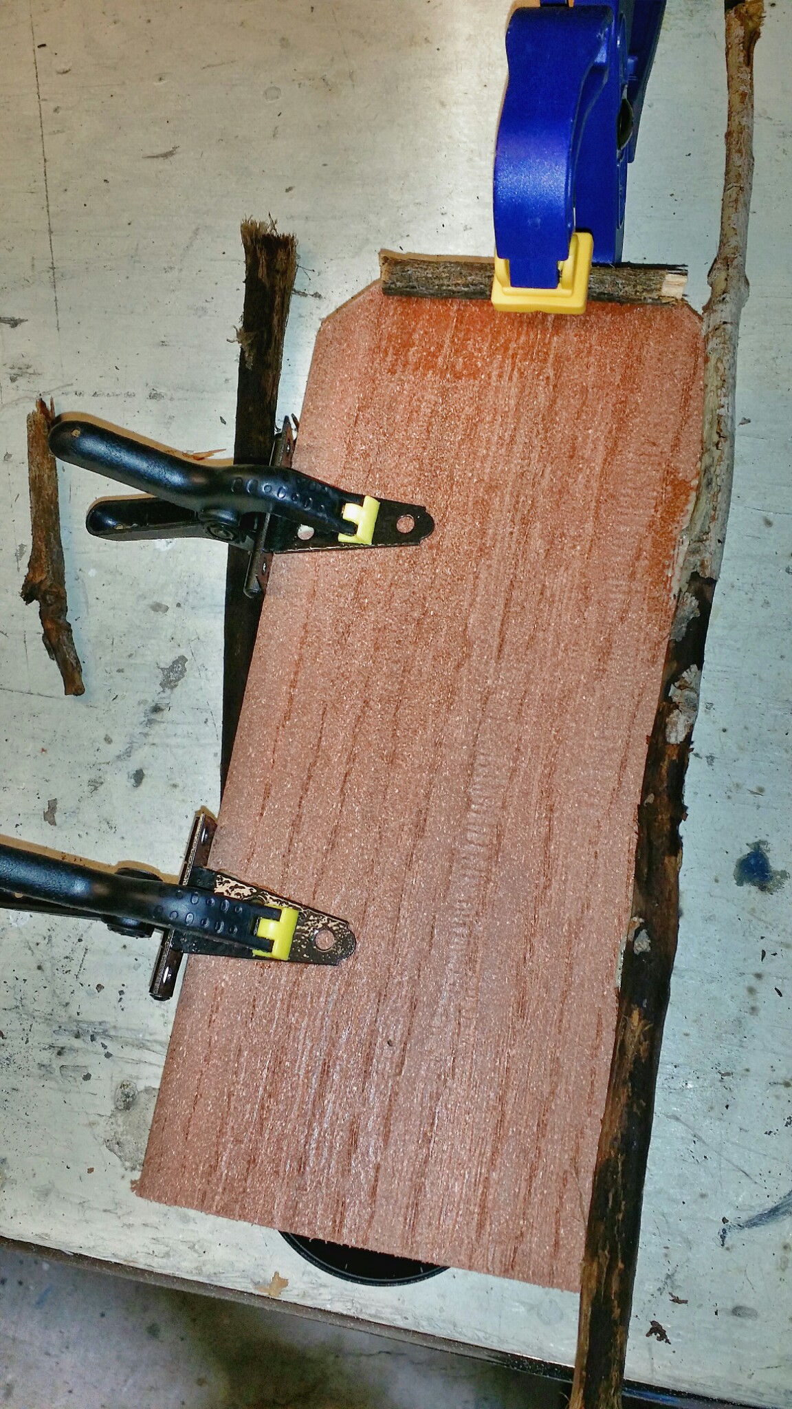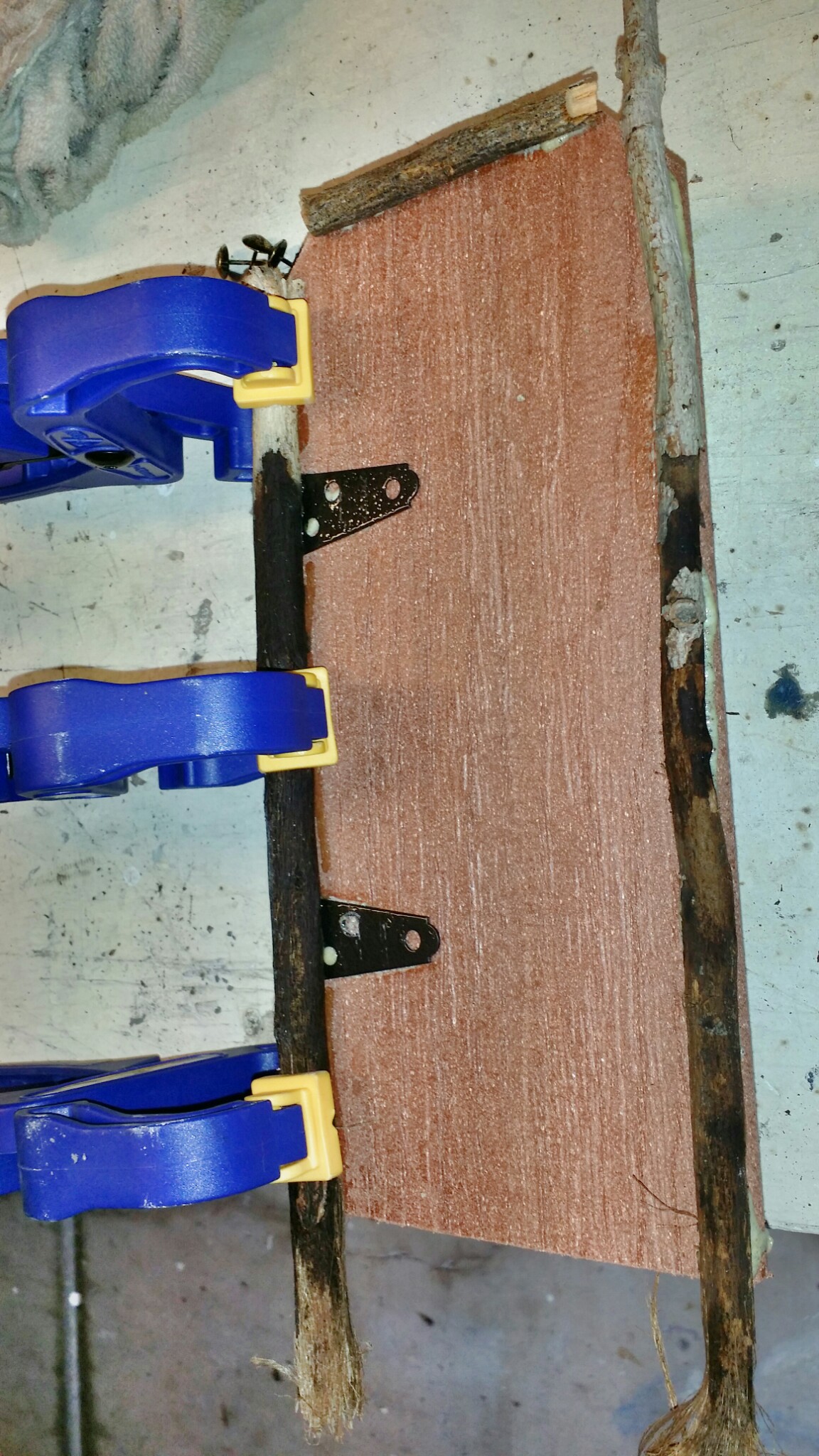 I cut some of the twigs the approximate length of the door height, and wet one edge of the door before running a thin bead of glue. Gorilla Glue expands a bit so use sparingly or it will balloon out and need to be cleaned up. I laid the twig on it and clamped each end, then added a little bend and clamped the middle.