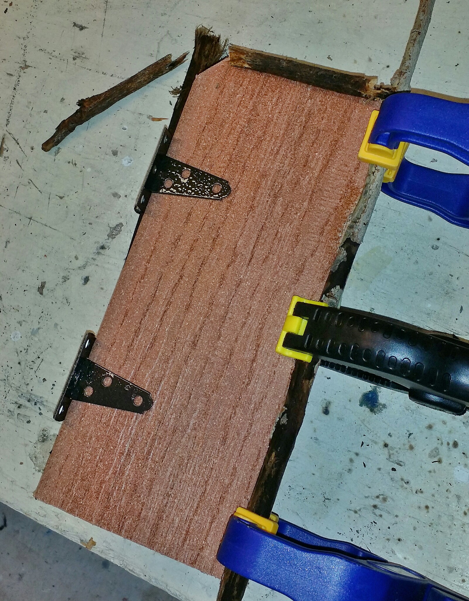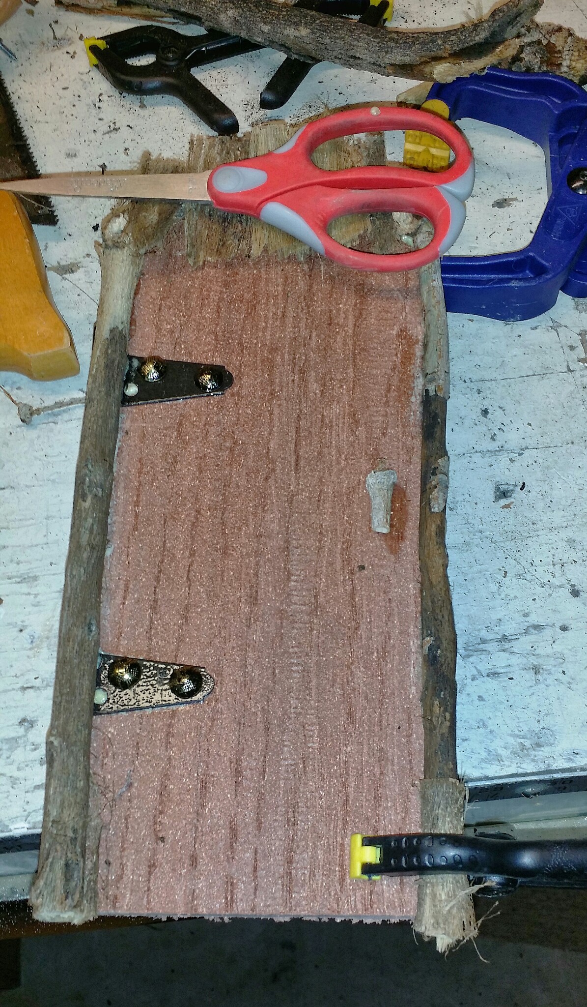 Once the hinges were dry, I placed them and glued them in place on the opposite side (the tacks are mostly decorative - I don't trust them to hold in the weather over the long term). The first piece was dry by now so I glued the top twig on at this time as well.