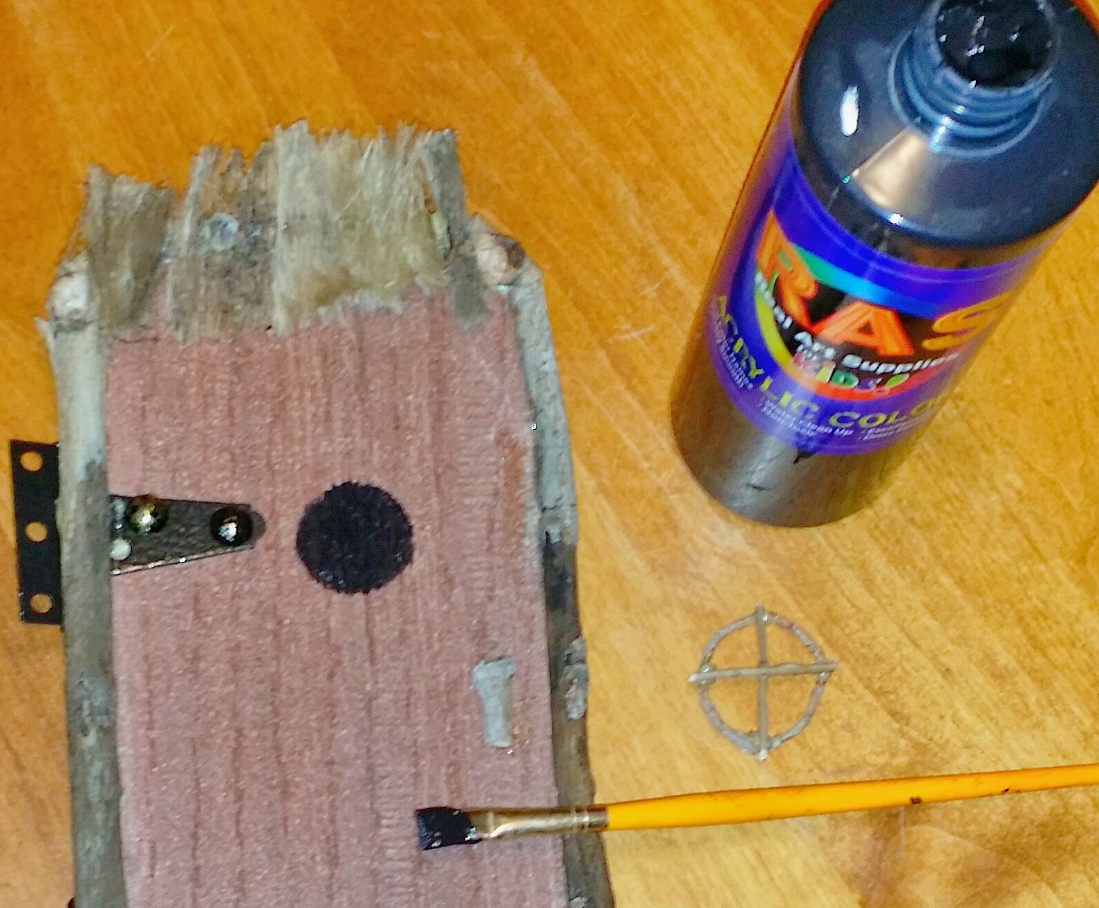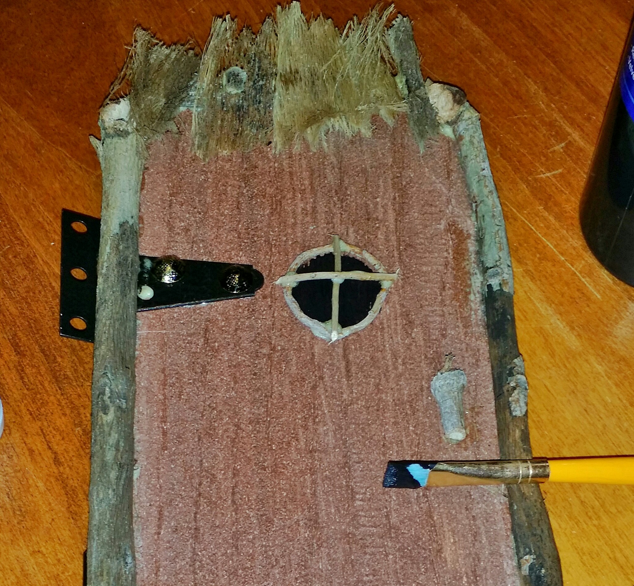 As things were drying I took a very thin twig and wrapped it into a circle and glued the ends. It will become a window/peephole in the door in the door. I also glued two more at 90 degrees to make a crossbar for the window.
