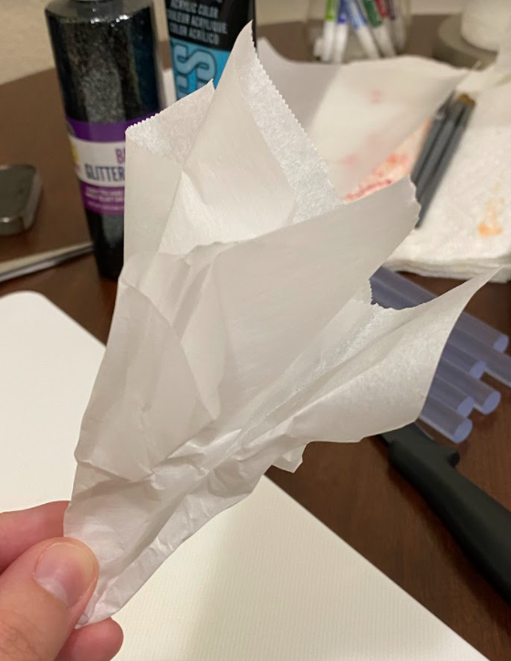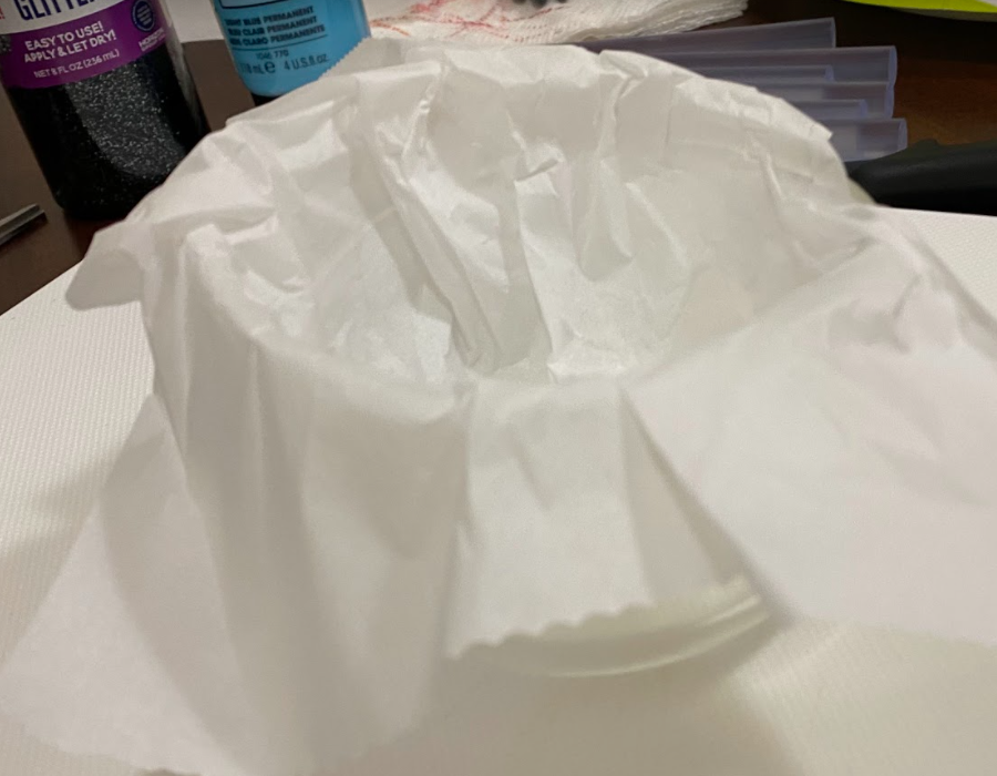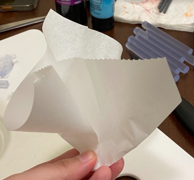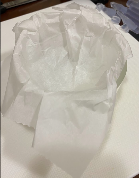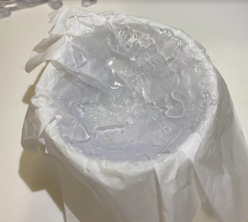 Make the mold for the base of the geode using parchment paper. Cut a square out of the paper and hold the middle of the paper in your left hand. With your right hand, fold it into a loose cone shape by bringing the corners towards the middle of the paper. The fold should look similar to what is shown above. Next, squeeze the paper in your hand to crinkle it a little, this gives it a more realistic looking base. Unfold the paper, place the square evenly into the cup, and press down the middle until it begins to take the shape of the cup. Fold the parchment paper over the edges of the cup to create a bowl shape.