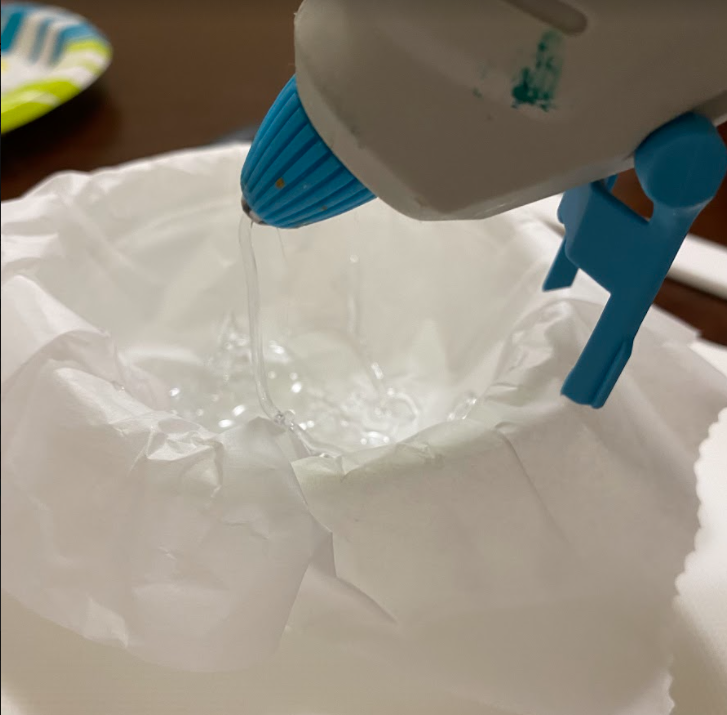 Coat the parchment paper base in hot glue, making sure to stay within the edges of the cup. Begin with putting a ring of hot glue around the top edge of the bowl shape, letting it drip down into the center. Pick up the container and rotate as necessary. Continue applying hot glue on the inside until the paper is covered in an even layer or as close as possible. Let sit for at least 15 minutes until the hot glue has dried and cooled. A thicker layer will require more time to dry. For a faster drying time, place the entire cup and base mold into the refrigerator. After the hot glue has completely settled, check to make sure there are no holes in the base. Once the base has been checked, take it out of the cup and remove the parchment paper from the glue. Do not remove the parchment paper before the glue is completely dry or the geode will lose its round shape. Optional: to make it more realistic, trim the top edge of the geode to give it a rough shape.