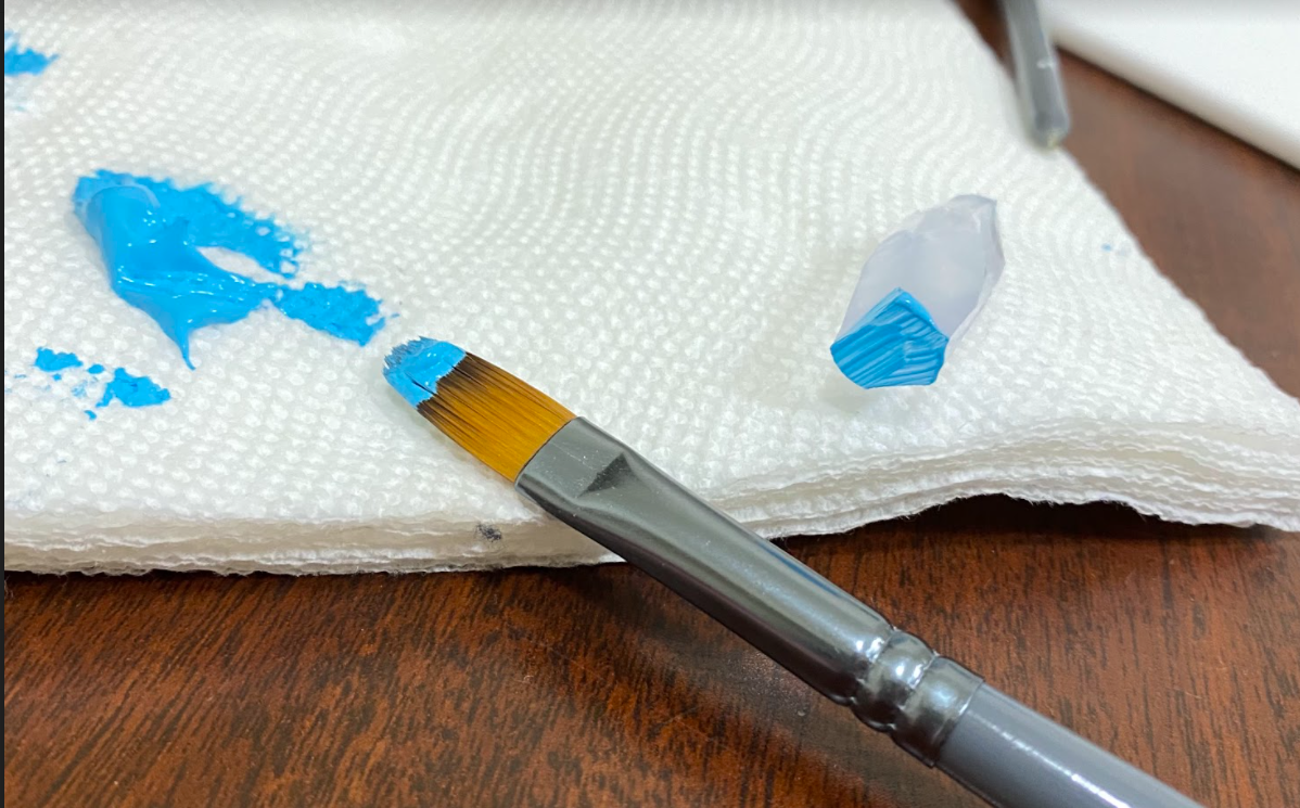 Use a light coat of your acrylic paints to color the bottom edge of the larger crystals. This will give the crystals their color. Make sure to dip your paint brush in the water and wipe it off on a paper towel after use. Arrange each painted crystal in the middle of the base, leaving just enough room for the small shavings to be placed in between. Then use a little hot glue to stick each large crystal onto the base. Place them at various angles to make the look more natural. For a more vibrant color, paint a light layer of paint on the base around the large crystals, however this step is optional. Next, add the medium crystal chunks around the larger crystals. Last, put some hot glue in the remaining space of the base. Then sprinkle the remaining smaller crystals on top of the hot glue.